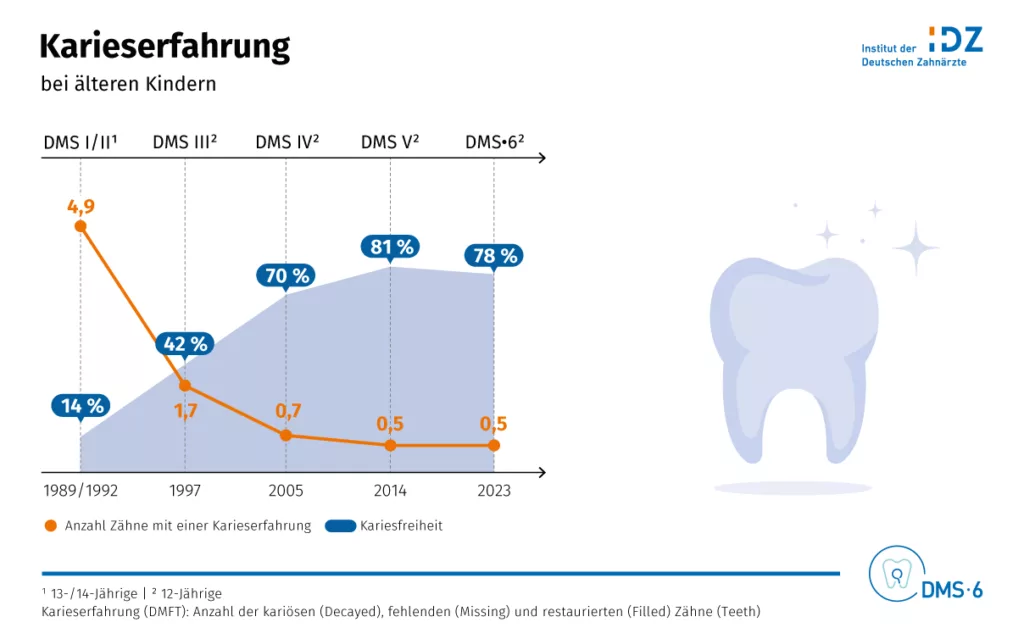 Allerdings wurde bei der DMS 5 bereits ein höherer Prozentsatz kariesfreier Gebisse verzeichnet als in der DMS 6; 81,3% besaßen vor 10 Jahren keine Karieserfahrung in der bleibenden Dentition. Der DMTF-Wert von 0,5 ist dagegen gleichgeblieben. Eventuell hat Corona durch Ausfall der Gruppenprophylaxe den Positivtrend der vergangenen Jahrzehnte abgebremst. Von Prof. Jordan wurden auch Migrationsbewegungen als mögliche Ursache genannt.