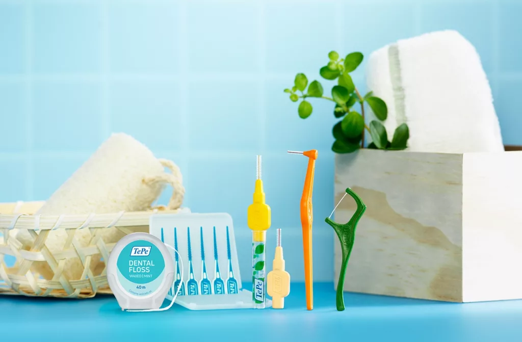 Wenn sogar die kleinste Interdentalbürstengröße nicht locker und ohne Druck in die Zahnzwischenräume passt, empfiehlt sich die Nutzung von Zahnseide. Bei TePe ist diese in unterschiedlichen Ausführungen erhältlich. Zum Beispiel als TePe Dental Floss, eine Zahnseide aus recycelten Wasserflaschen, die sich bei Verwendung ausdehnt und Biofilm besonders gründlich aufnimmt. Außerdem bietet TePe das Bridge & Implant Floss an, eine dicke, flexible Zahnseide, die speziell für die Reinigung um Implantate, Brücken und Zahnspangen entwickelt wurde. Eine besonders komfortable Anwendung bietet der TePe GOOD MiniFlosserTM als vorgespannter Zahnseidehalter – auch unterstützend bei Kindern oder Senioren.