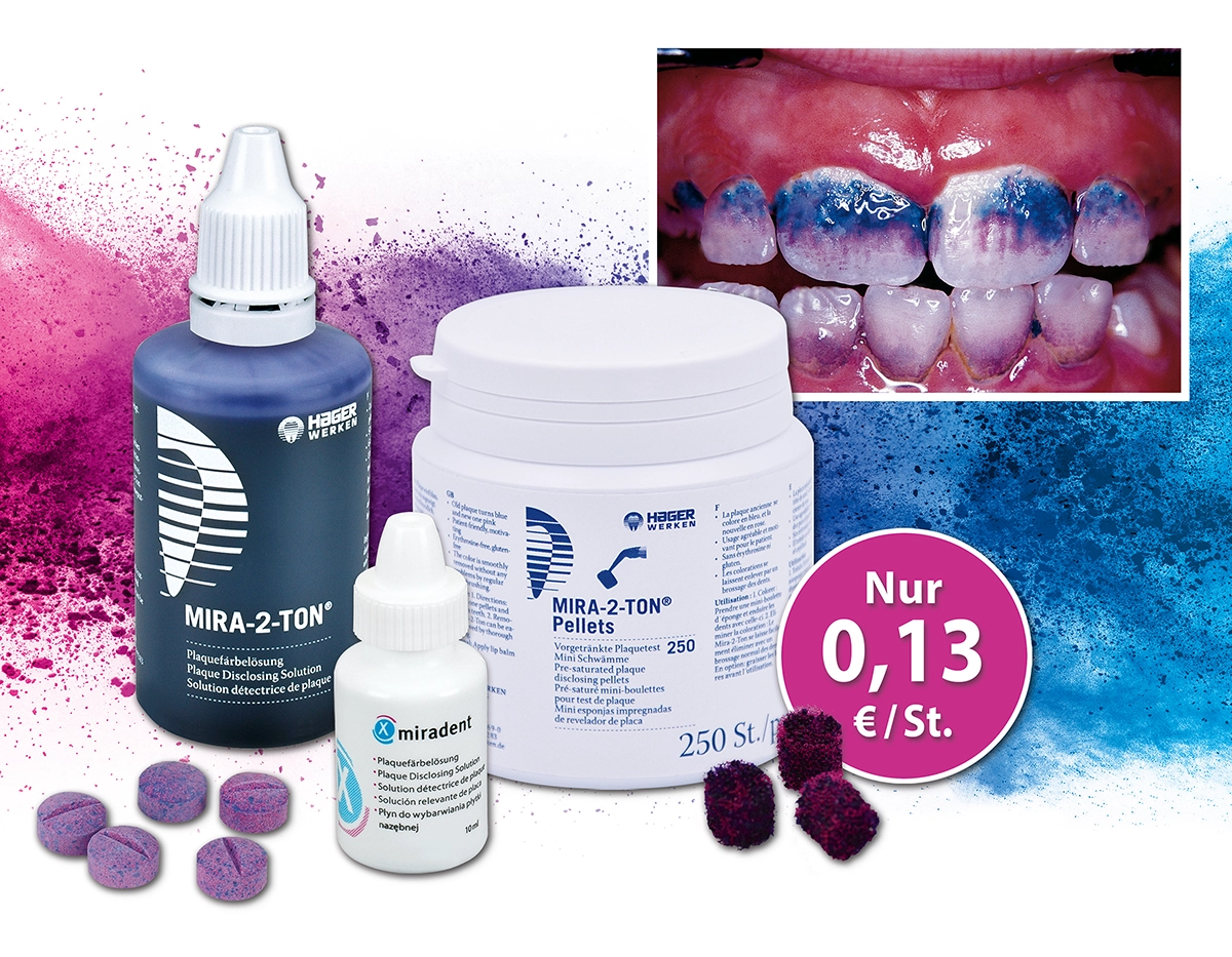 Mit den beliebten Mira-2-Ton Produkten (erythrosin- und glutenfrei) findet man seit über 25 Jahren eine zuverlässige Lösung. Plaque- und Biofilmanlagerungen werden durch die Darstellung in zwei Farben sehr eindrucksvoll sichtbar. Älterer Biofilm färbt sich blau, neuerer Biofilm rosa. Dies ermöglicht eine schnelle Identifikation von Problemstellen.