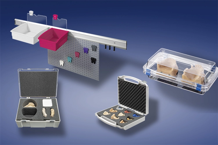 Dentalkoffer gibt es in sechs Größen und in Weiß, Blau und Grau. Mit Schaumeinlagen und verschiedenen Fächereinteilungen sind sie ideal für Archivierung, Transport und Versand von Zahnarbeiten.