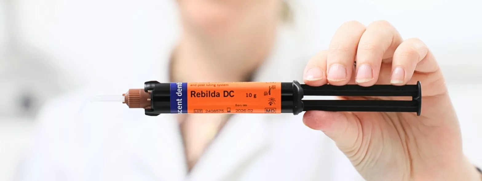 Darüber hinaus zeichnet sich Rebilda DC durch seine dentinähnlichen Eigenschaften aus: So ist das Material nicht nur sehr gut beschleifbar wie Dentin, sondern weist auch eine entsprechende Härte auf, sodass die spätere Präparation einfach erfolgen kann und sich der Aufbau bei Belastung verhält wie der natürliche Zahn. Auch die Dualhärtung von Rebilda DC bringt gleich mehrere Vorteile mit sich: Selbst bei ungünstigen Bedingungen für die Lichtpolymerisation härtet das Material zuverlässig mit hoher Endfestigkeit aus und kann zudem auch im Wurzelkanal angewendet werden. Sollte für den Aufbau eines tief zerstörten Zahnes also ein Wurzelstift benötigt werden, kann sowohl für das Einkleben des Stiftes als auch für den Stumpfaufbau das gleiche Material verwendet werden. Dieser sogenannte „Monoblock“ trägt zur Festigkeit des gesamten Aufbaus bei.