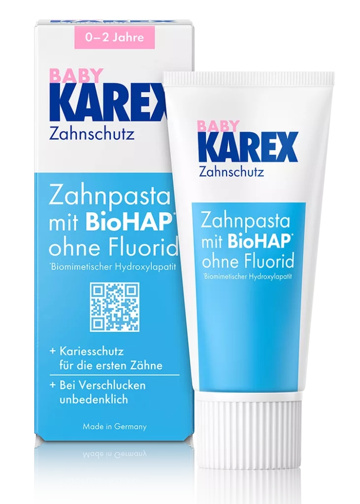 Die neue BABY KAREX Zahnpasta schützt die ersten Zähne von Anfang an mit biomimetischem Hydroxylapatit (BioHAP) vor Karies. Der Wirkstoff remineralisiert den Zahnschmelz und ist bei Verschlucken unbedenklich. BABY KAREX ist ohne Fluorid, zudem aromafrei und trotzdem angenehm im Geschmack.