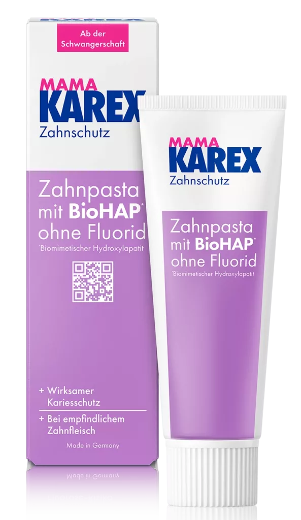 MAMA KAREX mit BioHAP und ohne Fluorid wurde für die speziellen Anforderungen an die Mundhygiene während der Schwangerschaft und Stillzeit entwickelt. BioHAP wirkt effektiv gegen Karies, schützt hormonbedingt empfindliches Zahnfleisch und unterstützt die Remineralisation der Zähne. MAMA KAREX ist ebenfalls ohne Fluorid und eignet sich besonders gut für werdende und stillende Mütter, die sich bewusst mit der eigenen Gesundheit und der ihres Babys auseinandersetzen.