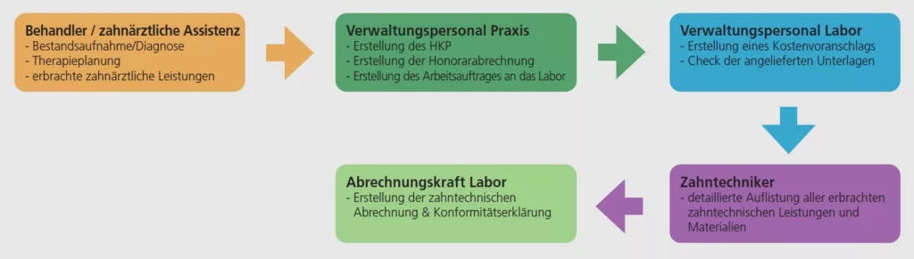 Im Idealfall wickelt man den gesamten Dokumentationsprozess digital über die in Praxis und Labor verwendeten Software-Lösungen ab. In diesem Fall tragen alle Beteiligten ihre Arbeitsschritte zeitnah in die Software ein. Die Zahnarztpraxis übermittelt die Daten aus ihrer Software an das Dentallabor, das die Daten wiederum in die eigene Software übernimmt. So kann eine lückenlose Dokumentation entstehen, auf deren Basis die Abrechnung erstellt werden kann.
