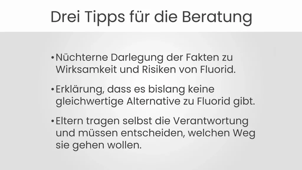 „Wir raten Eltern und werdenden Eltern, mit dem Durchbruch des ersten Zahnes ihres Kindes einen Termin beim Zahnarzt/einer Zahnärztin wahrzunehmen. Dies ist der Zeitpunkt, an dem Eltern den Empfehlungen der Fachgesellschaften zufolge idealerweise von der Gabe von Fluoridtabletten absehen und beginnen, eine Zahnpasta mit 1.000 ppm Fluorid zu verwenden, also auf eine lokale Fluoridanwendung umsteigen. Wichtig dabei ist die korrekte Anwendung und Dosierung, nämlich eine reiskorngroße Menge. Es kann hilfreich sein, die Menge anhand eines Reiskorns zu verdeutlichen“, so Djelassi. Sie empfiehlt: „Klären Sie über das Fluorose-Risiko auf und darüber, dass dieses Risiko im Vergleich zum kariespräventiven Nutzen von Fluorid als sehr gering einzuschätzen ist.“