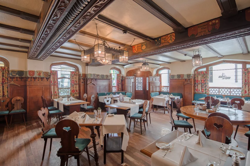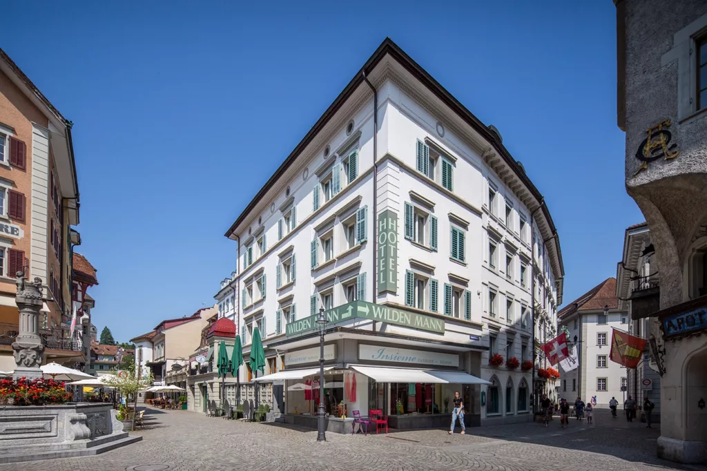 Der Clou aber ist: Für 12 SFr kann sich jeder Besucher selbst seine Tafel Schokolade aus allen möglichen Zutaten zusammenstellen. Wenige Bahnstationen weiter ist man in Luzern. Hier ist unser Ziel – unweit der von zwei mittelalterlichen Holzbrücken überspannten Reuss – das traditionsreiche Hotel „Wilden Mann“. Die 1517 erstmals erwähnte Gaststube zum „Wilden Mann“ wurde bald ergänzt durch Unterkünfte für Reisende. In der Trinkstube des Gasthauses genoss man bereits um 1800 kostbare Trinkschokolade. Der hohe Preis war darauf zurückzuführen, dass der Kakao nur von der benachbarten Apotheke bezogen werden konnte. Schon im 19. Jahrhundert zählte der „Wilden Mann“ zu den führenden Hotels Luzerns, in dem Reisende aus aller Welt logierten, die auch gutes Essen zu genießen wussten. Dank begnadeter Architekten ist das heute zur „Romantik“-Gruppe gehörende, aus sieben Gebäuden mit 48 Zimmern und Suiten komponierte Hotel ein Kleinod, das Seinesgleichen sucht. Nicht zuletzt auch wegen der vorzüglichen Küche der urgemütliche „Burgerstube“ (14 Gault-Millau-Punkte), deren Wände Wappen alter Luzerner Familien schmücken.
