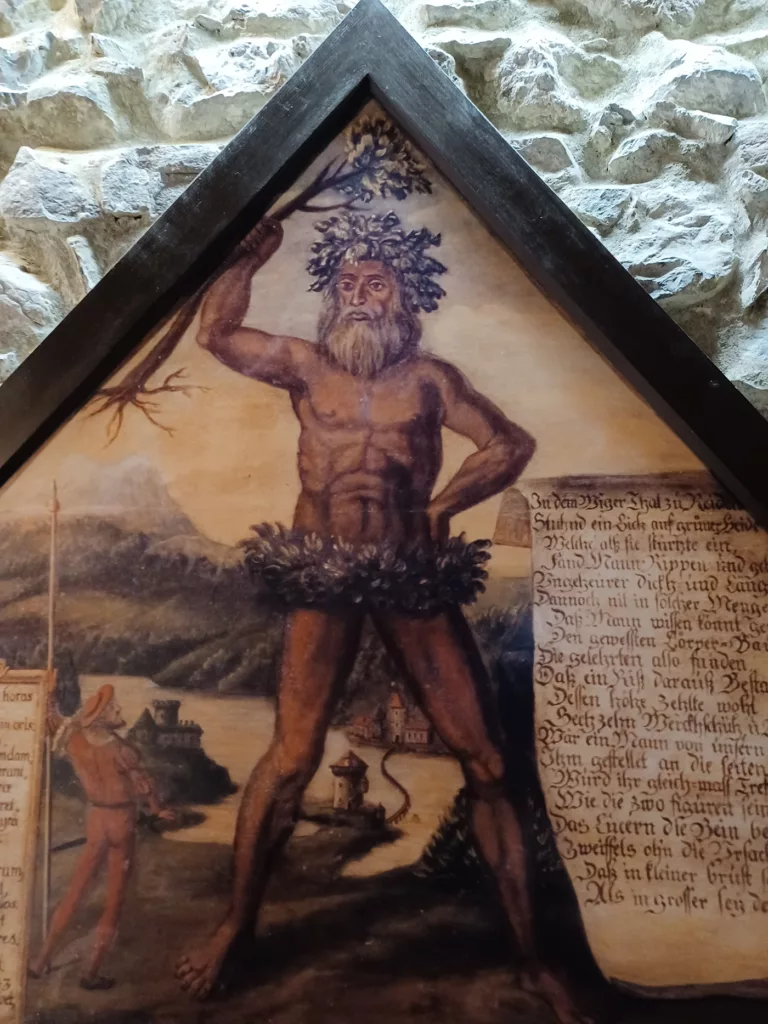 Alles strahlt eine charmante Behaglichkeit aus. Beim reichhaltigen Frühstück haben wir unsere Freude an dem großen Bild an der Wand vom „Wilden Mann“, der mit dekorativem Lendenschurz einen ausgerissenen Baumstamm schwingend breitbeinig über der Reuss steht, die Stadt Luzern und ihre Bewohner beschützend. Im benachbarten Natur-Museum kann man tatsächlich drei große Knochen bestaunen, die vor 400 Jahren im nahen Ort Reiden gefunden und als jene eines riesenhaften „wilden Mannes“ gedeutet wurden. (Sie gehörten vermutlich zu einem Mammut. Doch das bleibt unter uns …)