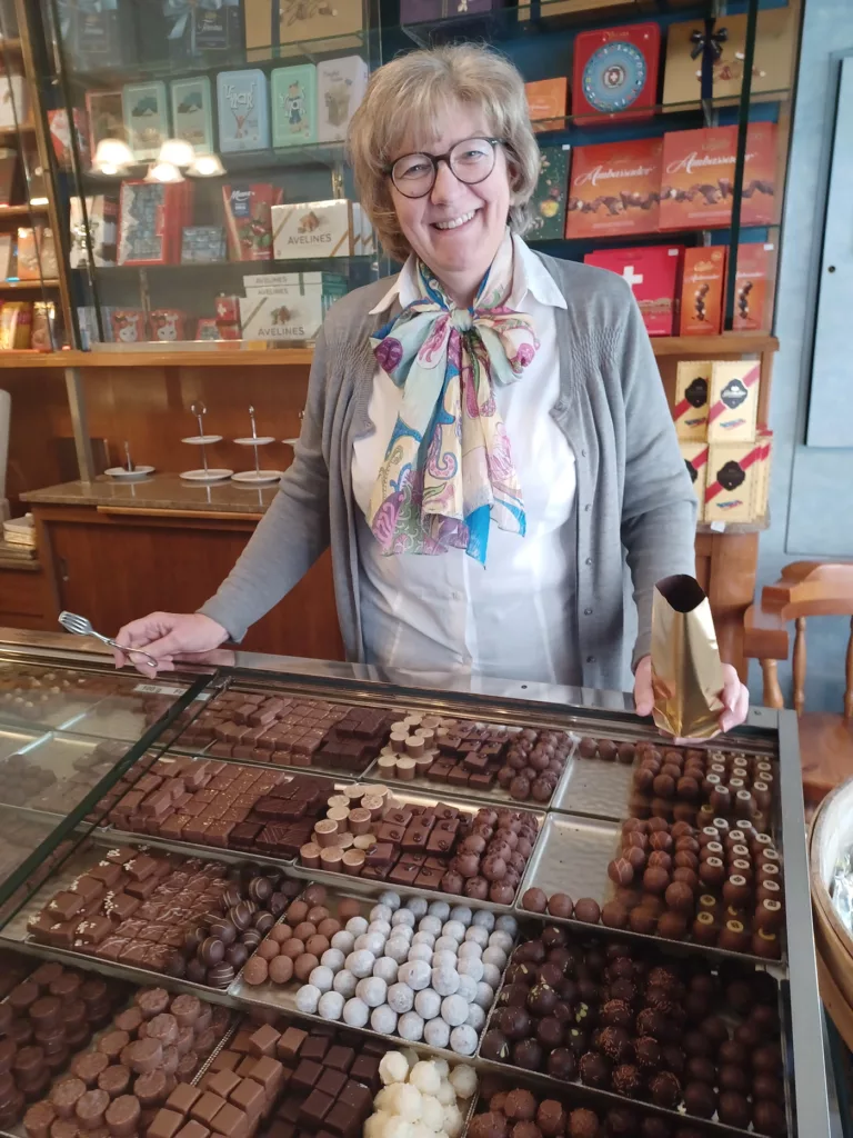 Das Geheimnis: Täglich wird in kleinen Mengen tagesaktuell eine neue Komposition hergestellt. Jeder Kunde kann für sich sogar eigene Kreationen bestellen. Zur „Entsüßung“ gönnen wir uns einen Lunch im „Wilden Mann“. Danach schauen wir gleich um die Ecke im kleinen Laden „au Cachet“ vorbei und staunen über 75 verschiedene Pralinen- und Schokoladenherrlichkeiten.