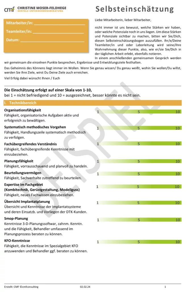 Extratipp: Nutzen Sie kein Schulnotensystem. Dies weckt bei vielen Mitarbeitenden schlechte Assoziationen an die eigene Schulzeit. Das Dokument können Sie sowohl digital als ausfüllbare pdf-Datei angelegen oder analog als gedrucktes Handout ausgeben.