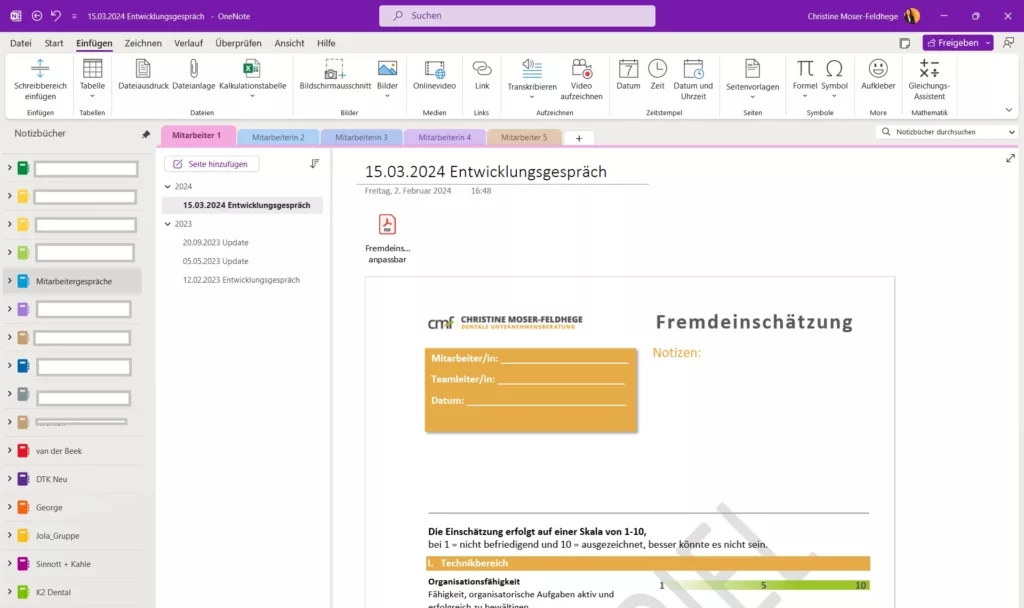 Die dentale Welt ist eine digitale Welt. Da liegt es nahe, auch in der Dokumentation der Mitarbeitergespräche auf digitale Strukturen zu setzen. Für alle, die keine digitale Plattform für ihr Mitarbeitermanagement nutzen (beispielsweise Personio, Hauffe HR Services, Staffomatic), gibt es auch eine einfache Möglichkeit über OneNote, die in der üblichen Microsoft-Lizenz enthalten ist. Das geht in wenigen Schritten: • OneNote öffnen • Notizbuch „Mitarbeitergespräche“ anlegen • Einen Abschnitt je Mitarbeiter/-in mit Namen anlegen • Im Abschnitt je Mitarbeitergespräch eine Seite anlegen • Jahr als Oberseite anlegen • Nach Datum (oben immer das aktuelle) sortieren, als Unterseite anlegen (Abb. 2) Wenn Sie über ein Tablett mit I-Pencil verfügen, können Sie dort direkt Ihre Notizen mitschreiben. Wenn Sie zudem alles über OneDrive verknüpfen, können Sie immer auf alle Informationen über Handy, Tablet oder PC zugreifen. Praxistipp: Das Verarbeiten und Speichern personenbezogener Unternehmensdaten über One-Drive (Microsoft) ist nur DGSVO-konform, wenn Sie von Ihren Mitarbeiterinnen und Mitarbeitern eine entsprechende Nutzereinwilligung haben. Passen Sie ggf. Ihre eigene Datenschutzerklärung an. Dabei ist es hilfreich, auf die jeweiligen Datenschutzbestimmungen und Nutzungsbestimmungen des Anbieter zu verweisen, in diesem Fall auf die von Microsoft. |