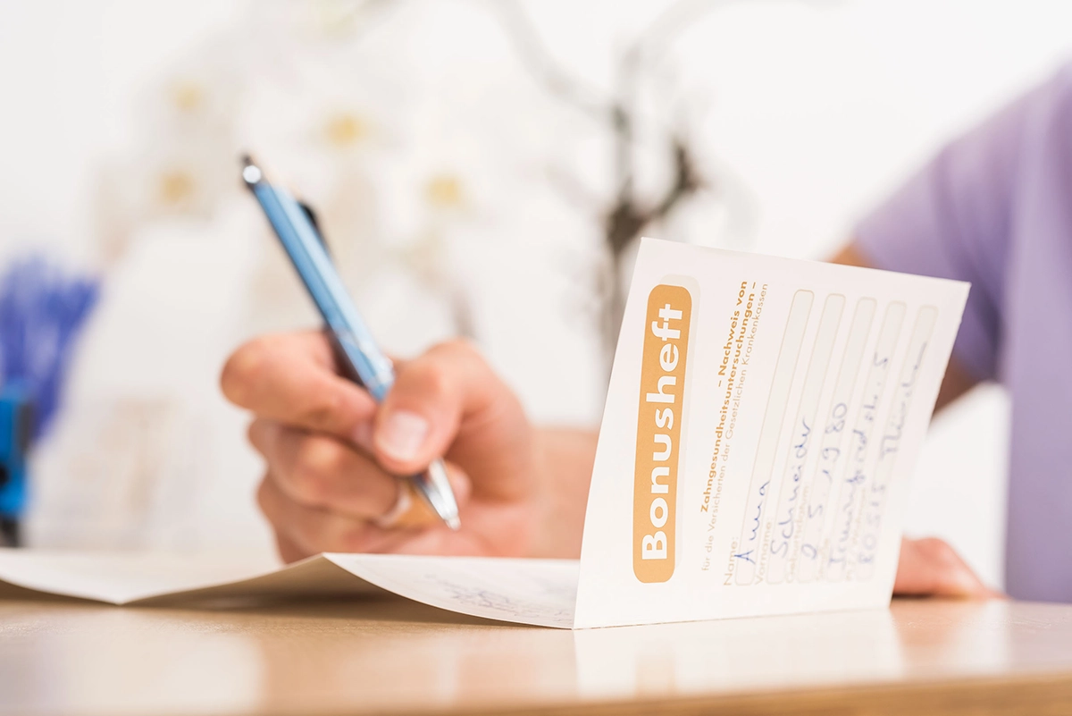 Knapp die Hälfte der gesetzlich Versicherten erhält bei Zahnersatz nicht den maximal möglichen Zuschuss, da sie die Bonusregelung nicht erfüllt. Die gesetzlichen Krankenkassen bezuschussen Zahnersatz mit 75 Prozent der Regelversorgung, wenn Versicherte die vergangenen zehn Jahre regelmäßig jedes Jahr zur Vorsorge in ihrer Zahnarztpraxis waren und dies im Bonusheft dokumentiert ist. Fehlt für 2024 noch ein Eintrag? Dann schnell einen Vorsorgetermin vereinbaren!