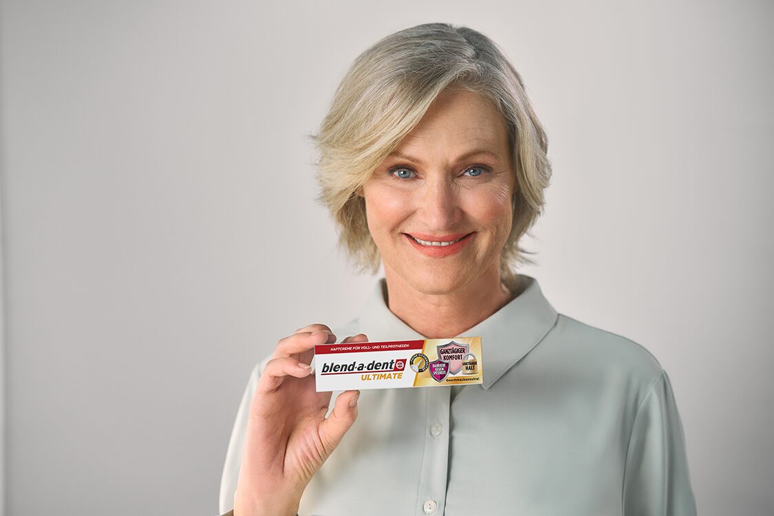 Tatsächlich kann Haftcreme die Lebensqualität von Prothesenträger/-innen positiv beeinflussen: Mehrere Studien (1) haben die Auswirkungen der Verwendung von Haftcreme auf das psycho-soziale Wohlbefinden untersucht und signifikante Verbesserungen festgestellt. Expert/-innen führen das vor allem darauf zurück, dass diese mit einer verbesserten Prothesenleistung zusammenhängen. So sitzt auch bei Nicole die Prothese mit blend-a-dent mit 10-mal stärkerem Halt im Vergleich zur Nutzung ohne Haftcreme (2) fest im Mund. Nachgewiesenermaßen bildet Haftcreme auch eine wirksame Barriere (3) gegen Speisereste. So erhöht sich sowohl die Sicherheit beim Tragen als auch der Komfort – da verhindert wird, dass sich z.B. Krümel festsetzen und das Zahnfleisch reizen.