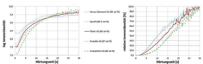 Diese normierten Härtungskurven bieten die Möglichkeit, die Härtungsgeschwindigkeiten der unterschiedlichen Komposittypen untereinander qualitativ zu vergleichen und grundsätzliche Aussagen im Hinblick auf ihre Harzzusammensetzung bzw. ihr Materialkonzept zu treffen. Zusätzlich wurde die relative Ionenviskosität nach 20 Sekunden, ausgewertet. Sie liefert Informationen über den Grad in % der erreichten Aushärtung nach 20 Sekunden ? (Ion/20s), was der empfohlenen Belichtungszeit der meisten Materialien entspricht, im Verhältnis zur erreichten Viskosität nach der max. Belichtungszeit von 30 Sekunden (gerätebedingte max. Belichtungsdauer der Bluephase 20i im High-Modus).