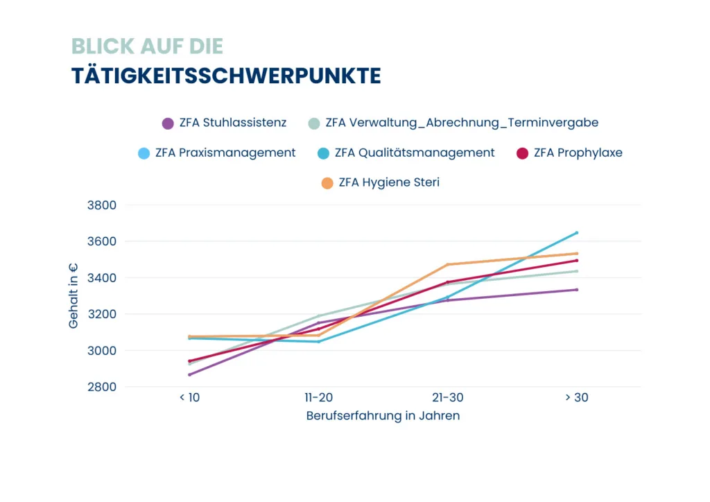 Die Ergebnisse der Studie zeichnen ein differenziertes Bild und machen dadurch erneut klar, wie wichtig ein transparenter Überblick über die Gehaltsstruktur wirklich ist. So zeigen die Daten deutliche Unterschiede in den Vergütungen der einzelnen Fachrichtungen. ZFAs oder ZMFs mit dem Tätigkeitsbereich Stuhlassistenz verdienen im Median 3.040 € brutto nach 10 Jahren Berufserfahrung. Der Median im Gehalt von ZMVs im Tätigkeitsfeld Rezeption, Empfang / Terminvergabe, Verwaltung und / oder Abrechnung liegt bei 3.998 € brutto. ZMPs mit dem Schwerpunkt Prophylaxe kommen auf ein Bruttogehalt von 3.695 € im Median. Alle Gehälter beziehen sich auf 40 Wochenstunden (inkl. etwaiger Sonderzahlungen). Das Gehalt steigt dabei deutlich mit der Berufserfahrung. Dennoch gaben 75 % der Teilnehmenden an, dass es in ihrer Praxis keine klare Systematik in der Gehaltserhöhung gebe – Gehaltserhöhungen erfolgen daher beim Großteil der Befragten ausschließlich durch direkte Anfragen.