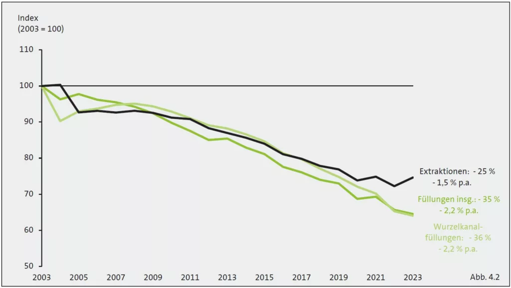 Die KZBV-Daten zeigen: Seit 2003 ist die Zahl der Extraktionen um ein Viertel zurückgegangen, Füllungen um 35%, Wurzelbehandlungen um 36% – wie gesagt: Wir haben mehr gesunde Zähne, wir haben bei den Erwachsenen weniger Füllungen (Abb. 11).