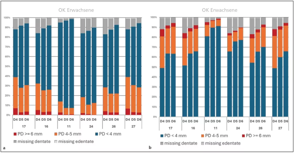 Wir betrachten nun die Indexzähne der Mundgesundheitsstudien (Abb. 7a, b). Sind tatsächlich mehr gesunde als stark erkrankte Zähne hinzugekommen?
