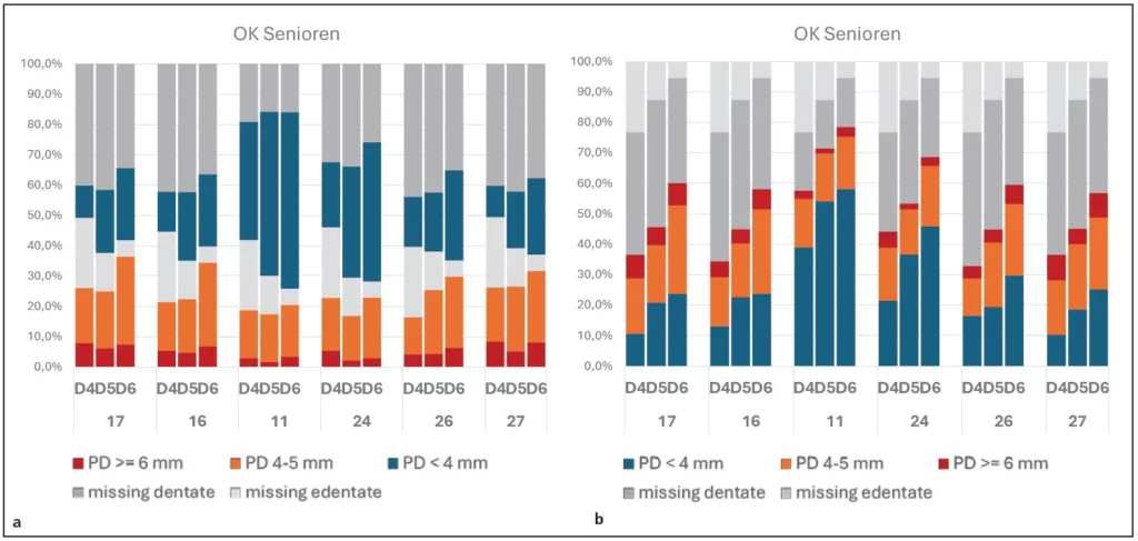 Bei Umstellung der Daten mit Fokus auf die Veränderung bei den gesunden Indexzähnen sehe ich bei den jüngeren Senioren ebenfalls eine positive Tendenz (Abb. 8a, b).