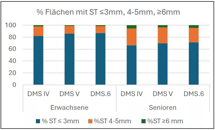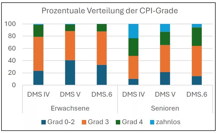 Der Verglich zwischen den Erhebungswellen zeigt uns, ob sich in der parodontalen Erkrankungslast etwas verändert hat und diese Frage der Entwicklung ist für das Versorgungssystem von großer Bedeutung. Wie oben schon gesagt, bezieht sich der Vergleich der Erhebungswellen der DMS auf maximal 12 Indexzähne mit je 3 gemessenen Flächen und nur auf die Sondierungstiefe und nicht auf den Attachmentverlust. Zu Beginn der Auswertungen war ich nicht zufrieden. Wir haben zunächst festgestellt, dass es insbesondere bei den Seniorinnen und Senioren keine Verbesserung gegenüber der DMS V gibt – im Gegenteil: Der Anteil schwerer Parodontitiden, also des CPI-Grads 4, hat sich von der DMS V zur DMS • 6 sogar leicht verschlechtert (Abb. 1, 2). Auch bei den jungen Erwachsenen zeigt sich nach einer Verbesserung zwischen DMS IV und DMS V keine weitere positive Entwicklung zur DMS • 6. Das war ernüchternd. Doch bei einer vertieften Analyse wurde klar: So einfach ist es nicht.