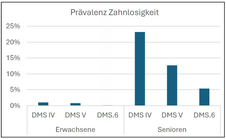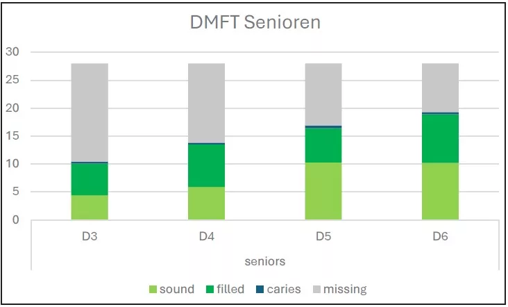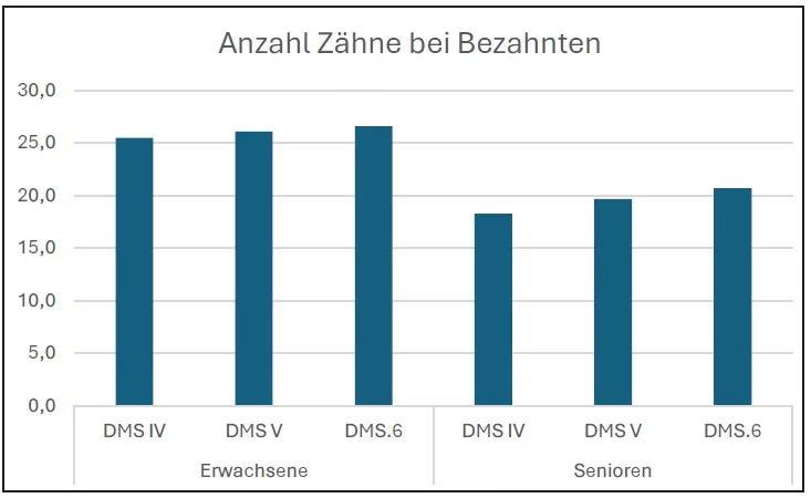 Die Anzahl der erhaltenen Zähne spielt eine entscheidende Rolle bei der Bewertung der Daten (vgl. Abb. 3, 4). So sank der Anteil zahnloser Senioren von 24% (DMS IV) auf 5% (DMS • 6). Parallel dazu stieg die durchschnittliche Zahnanzahl in dieser Altersgruppe von 18 auf 21 Zähne. Damit stehen mehr Zähne potenziell im Risiko, zu erkranken – ein Befund, der sich auch in anderen industrialisierten Ländern beobachten lässt [3].