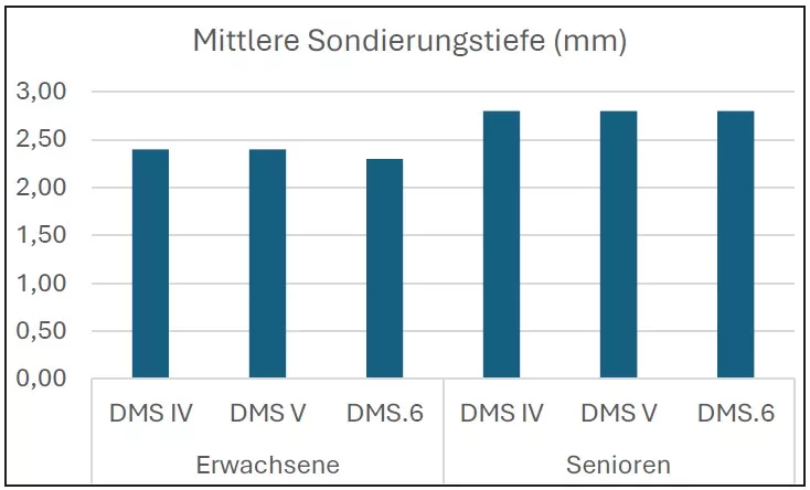 Untersuchte Gruppen: – Jüngere Erwachsene: 35- bis 44-Jährige; n=927 – Jüngere Senioren: 65- bis 74-Jährige; n=797 Die Teilnehmenden beantworteten Fragen zu ihrem Mundgesundheitsverhalten, zu ihrer allgemeinen Gesundheit und zur Mundgesundheit. Klinisch untersucht wurden die Sondierungstiefe (ST), der Attachmentlevel und das Bluten auf Sondieren an allen Zähnen, außer an Weisheitszähnen. Errechnet wurden die Anzahl und Verteilung der Zähne mit Sondierungstiefen in den Kategorien ≤3mm, 4–5mm, ≥6mm, die durchschnittliche Sondierungstiefe, der durchschnittliche Attachmentlevel. Berücksichtigt wurden die Klassifikation der Parodontalerkrankungen aus 2018, der Community Periodontal Index (CPI) sowie der Index der Centers of Disease Control and Prevention (CDC)/American Academy of Periodontology (AAP). Zum Vergleich mit den früheren DMS-Untersuchungen konnte ausschließlich der CPI herangezogen werden, da in den früheren Wellen kein Attachmentverlust erhoben wurde, und der Vergleich musste sich auf die Zähne 17, 16, 11, 24, 26, 27, 37, 36, 31, 44, 46, 47 beschränken. Der Community Periodontal Index (CPI; vormals: Community Periodontal Index of Treatment Needs; CPITN) wurde 1978 von der World Health Organization (WHO) als globaler Standard für das Screening von parodontalen Erkrankungen in Populationen etabliert. Die Einteilung: Grad 0, 1, 2 = keine Taschen Grad 3 = 4 bis 5mm ST (ST= Sondierungstiefe) Grad 4 >= 6mm ST |
