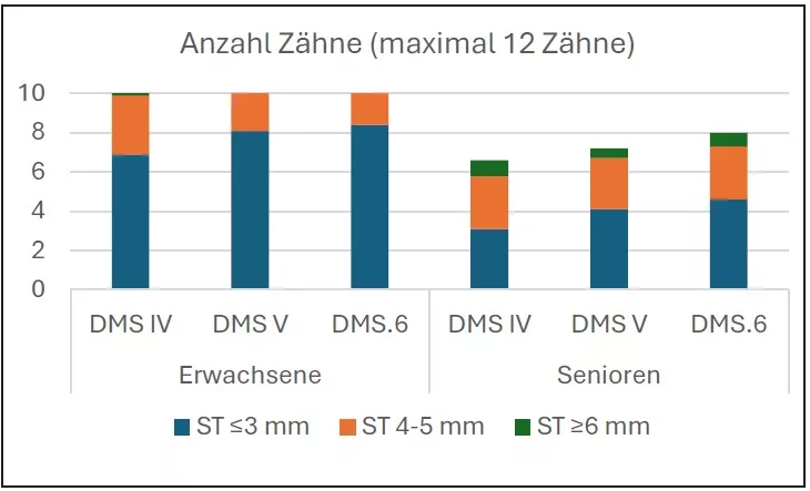 Schon in der DMS IV waren die Schneidezähne (Einser) deutlich seltener betroffen als die Molaren (Sechser). Die Molaren sind grundsätzlich stärker parodontal gefährdet als die Frontzähne.