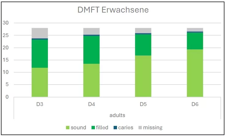 Wir betrachten nun die Indexzähne der Mundgesundheitsstudien (Abb. 7a, b). Sind tatsächlich mehr gesunde als stark erkrankte Zähne hinzugekommen?