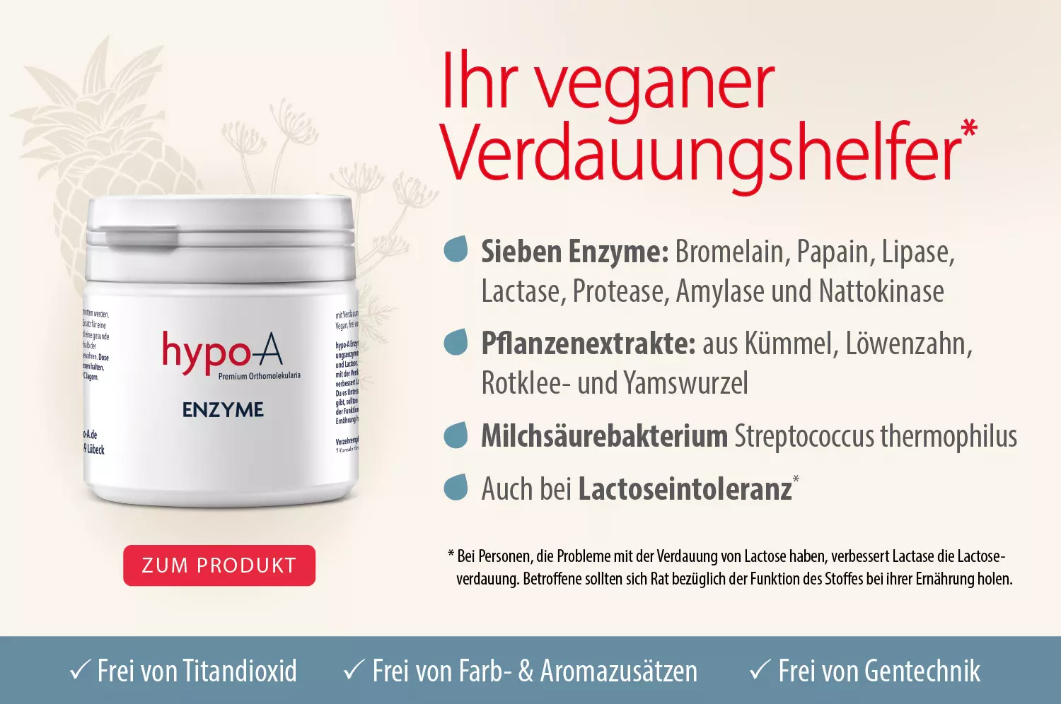 Eine ausgewogene Enzymversorgung ist von vielen Faktoren abhängig: Nicht nur die Ernährung, auch ihr Verbrauch variiert je nach Lebensweise, Stressbelastung, Alter, Krankheiten oder Medikation erheblich. Besteht kein veritabler Enzymdefekt, ist ein Mangel oft schwer erkennbar, weil er meist zu diffusen Beschwerden führt. Der menschliche Körper ist schließlich ein Meister der Improvisation und Kompensation. Wer ihn unterstützen möchte, kann das – gerade in Phasen von erhöhter Belastung, Schlafmangel und suboptimaler Ernährung – durch das Supplementieren mit hochwertigen Enzympräparaten tun. Besonders verträglich und frei von belastenden Zusatzstoffen ist hypo-A Enzyme mit 7 Verdauungsenzymen und natürlichen Pflanzenextrakten. Dank der Reinheit und Qualität ist das Produkt auch für Allergiker geeignet.