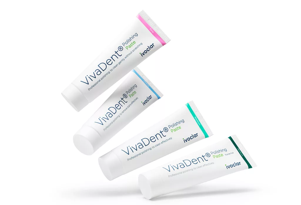 - VivaDent Polishing Paste: Die erste Wahl für eine effektive Politur mit minimaler Abrasion der Zahnhartsubstanz. Dank verschiedener Abrasionsstufen und Geschmacksrichtungen ermöglichen die VivaDent®-Polierpasten eine bedarfsorientierte Behandlung und sorgen für optimale Ergebnisse bei der professionellen Zahnreinigung unabhängig der Zahnflächen wie z.B. natürliche Zähne, Restaurationen, Implantate oder prothetische Rekonstruktionen. Selbst hochwertige Restaurationen behalten ihren Glanz. Jetzt neu in drei Geschmacksrichtungen erhältlich: Apfel, Kaugummi und Minze.