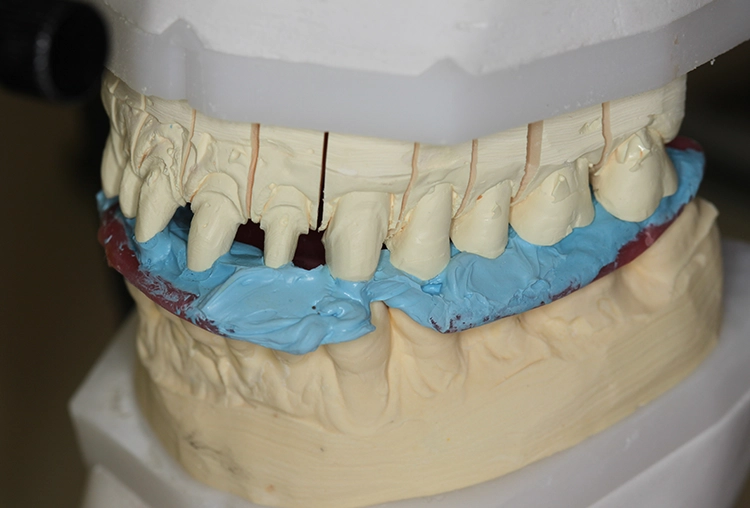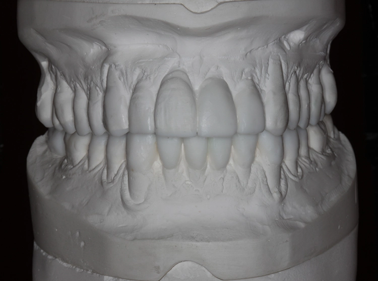 Die provisorische Versorgung der präparierten Zähne wurde mittels Silikonschlüssel (via Wax-up hergestellt) und Pro Temp Garant 3 A1 (Espe) durchgeführt. Nach der Kontrolle von Randpassgenauigkeit und Okklusion erfolgten die Ausarbeitung und Eingliederung als verblocktes Provisorium durch punktförmige Schmelzätzung mit 35%iger Phosphorsäure, Primen und Bonden mit Syntac Classic (Ivoclar). Für die horizontale und vertikale Kieferrelationsbestimmung in habitueller Interkuspidationsposition (HIKP) kam ein Bissregistrat aus hartem Wachs und Zinkoxid-Eugenol-Paste zum Einsatz.