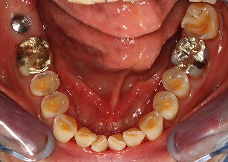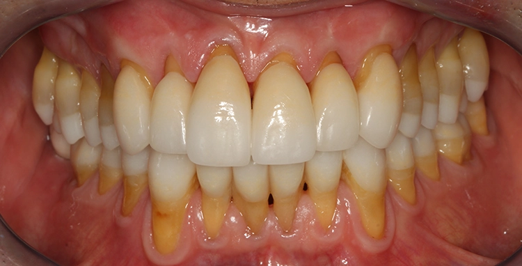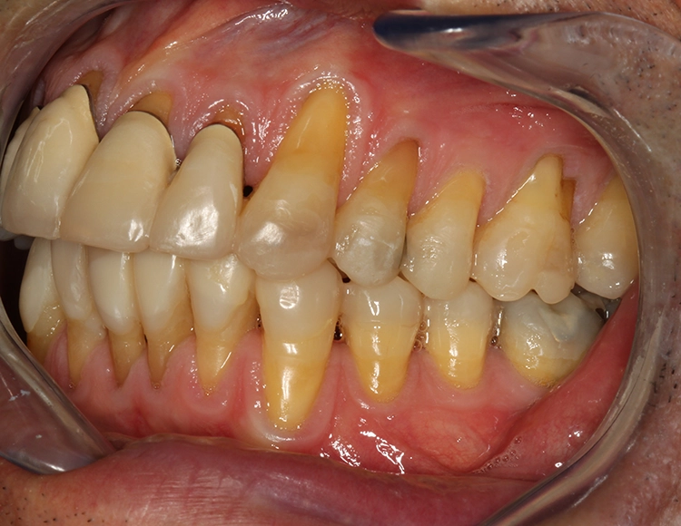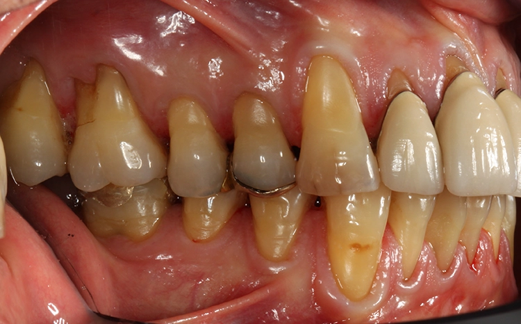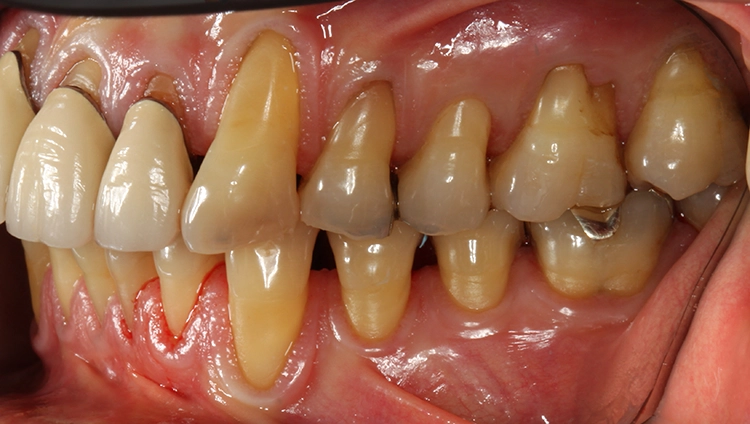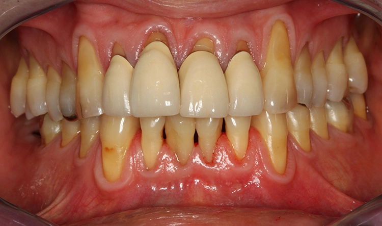 Parodontale Gesundheit bei Attachmentverlust, Bruxismus, Erosion. Abbildung 1 sowie 6 bis 9 zeigen den Anfangsbefund als intraoralen Fotostatus.*