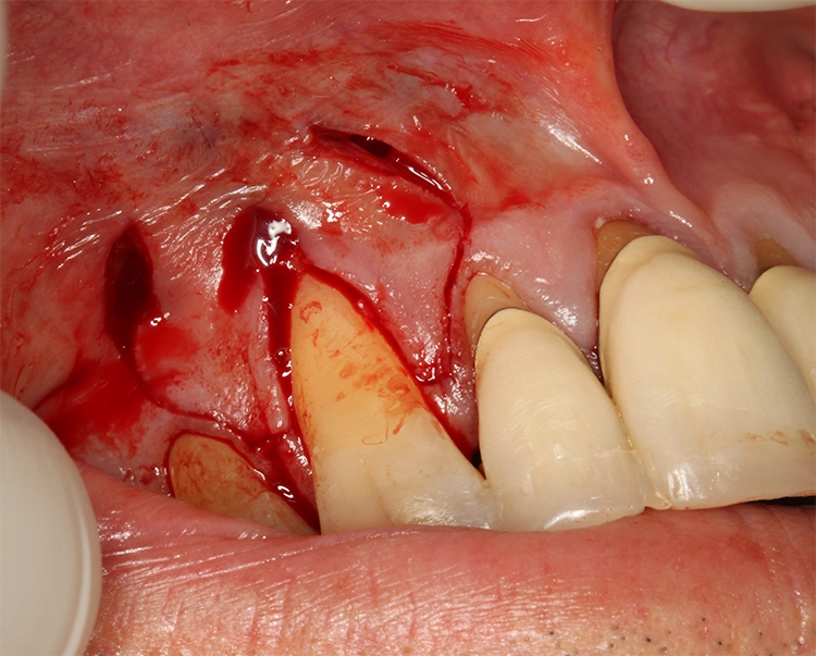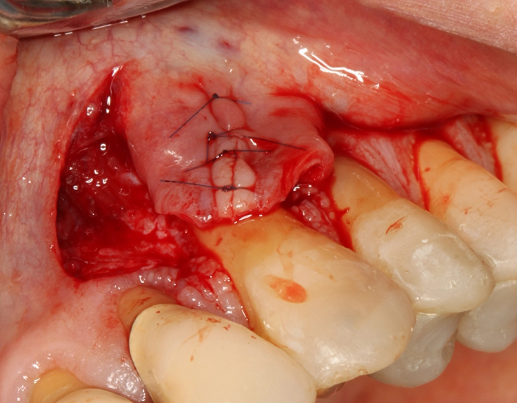Für die plastische Rezessionsdeckung an den Zähnen 13 und 23 mithilfe von doppelten Papillalappen nach Cohnen und Ross [2], Bindegewebetransplantaten und Schmelz-Matrix-Proteinderivat wurde die Schnittführung mit Split-Flap-Bildung so gewählt, dass möglichst viel keratinisierte Gingiva generiert werden konnte und der Mindestabstand zu den Nachbarparodontien von 1 mm eingehalten wurde (Abb. 13). Ein Gewebekeil wurde apikal der Rezession entfernt und vorerst nur ein Läppchen gesplittet (Abb. 14). Die beiden gesplitteten Läppchen wurden vernäht, wobei ein Mukosaläppchen noch unmobilisiert blieb, um das Aneinandernähen zu erleichtern. Das Vernähen erfolgte von koronal nach apikal, danach wurde das zweite Läppchen vollständig mobilisiert (Abb. 15).