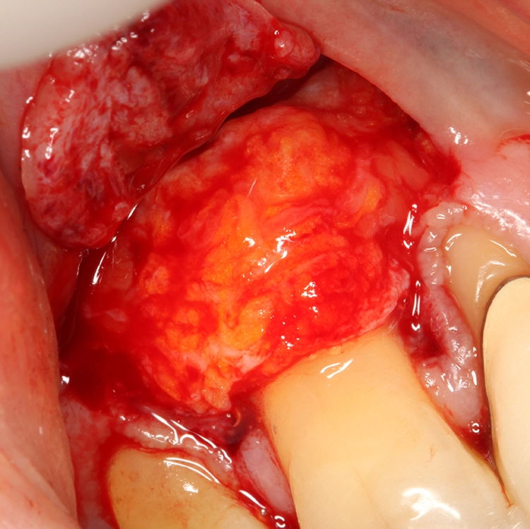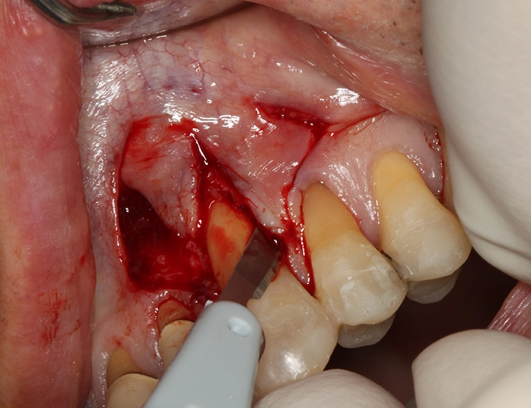 Es erfolgte eine plastische Rezessionsdeckung an den Zähnen 13 und 23 mit doppelten Papillenlappen nach Cohen et al. [2] unter Einsatz von Bindegewebetransplantaten und Schmelz-Matrix-Proteinderivat.