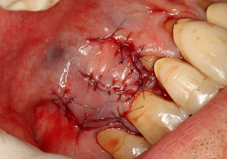 Abb. 17: Wundverschluss mit nicht resorbierbarem Nahtmaterial (7.0 monofilamentes Polyvinylidenfluorid, Seralene, Serag Wiessner).