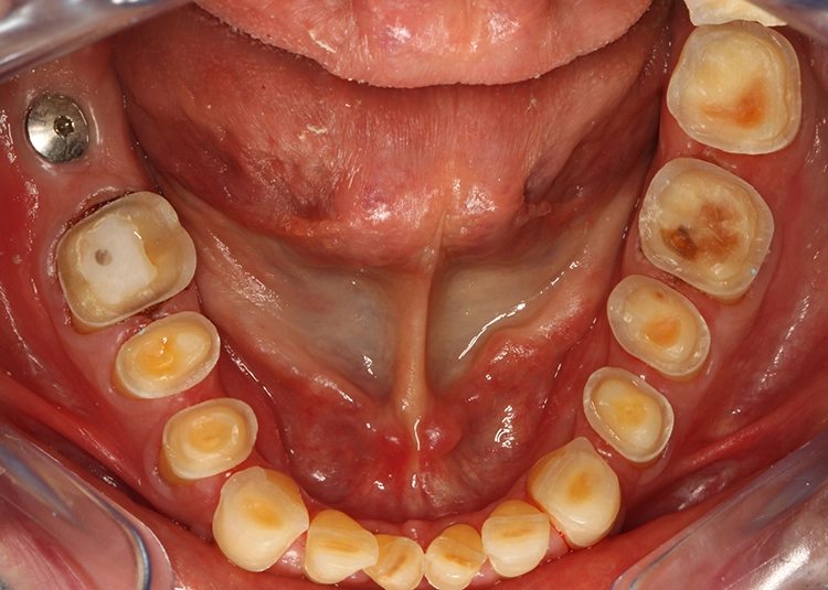 Es wurde die Etablierung einer neuen vertikalen und horizontalen Relation des Unterkiefers in zentraler Kondylenposition (ZKP) mit temporären Kompositaufbauten von 17–27 im Oberkiefer und 37–47 im Unterkiefer auf Basis des Wax-up mittels transparenter Silikonschlüssel (Elite Transparent, Zhermack) direkt im Mund des Patienten durchgeführt. Bei der Reevaluation nach der Adaptationsphase von 2 Monaten schienen sämtliche für die definitive Versorgung vorgesehenen Zähne sicher erhaltungswürdig. Der Patient fühlte sich mit der neuen horizontalen und vertikalen Bisslage sehr wohl, und es lagen keine Anzeichen oder Symptome einer Kiefergelenkdysfunktion vor.