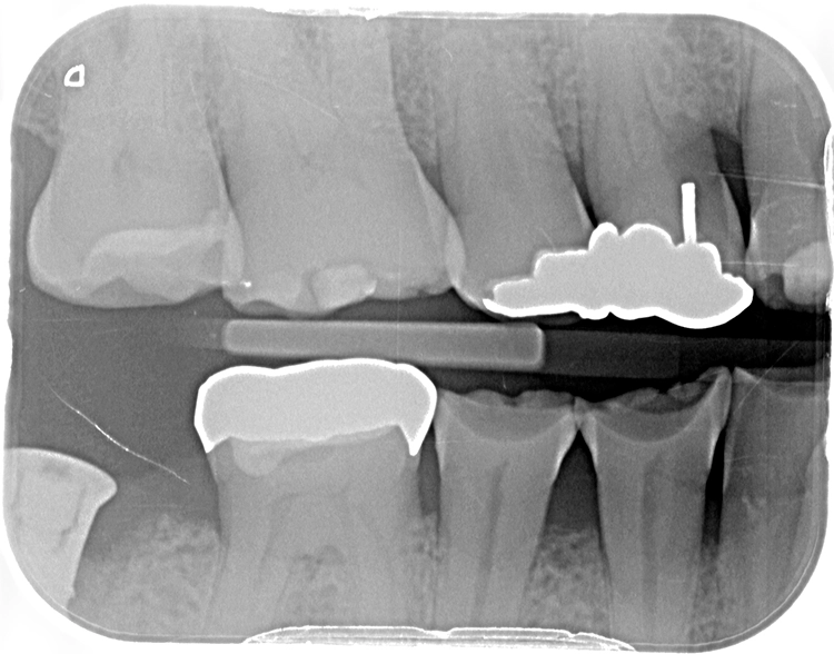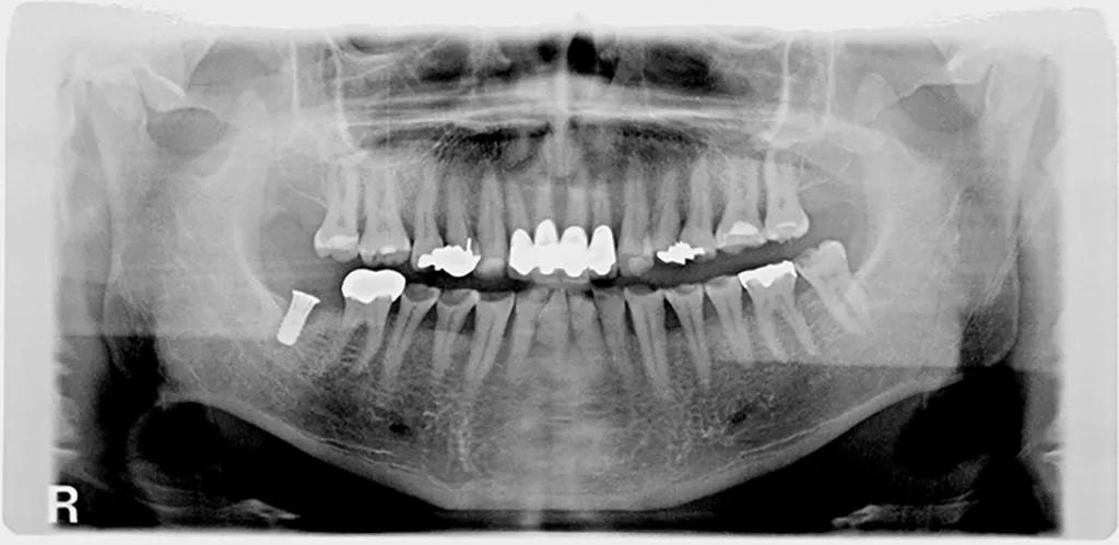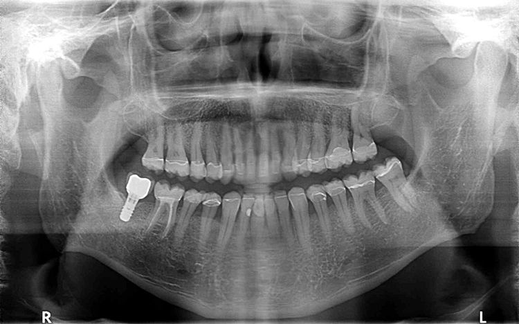 Die OPT-Aufnahmen zeigen keinen Anhalt auf nicht zahnverursachte Prozesse, dafür einen leichten bis mäßigen horizontalen und vertikalen Knochenabbau im Oberkieferseitenzahnbereich und generalisiert im Unterkiefer sowie einen periimplantären Knochenabbau in Regio 47 (Abb. 2). Die Zahnhartsubstanzdefekte imponieren als halbmondförmige Aufhellungen im Okklusalbereich von den Zähnen 37, 35, 34, 44 und 45. Es zeigen sich ebenso Aufhellungen im Approximalbereich mesial 24, distal 43 und mesial 37 (Abb. 4 und 5).