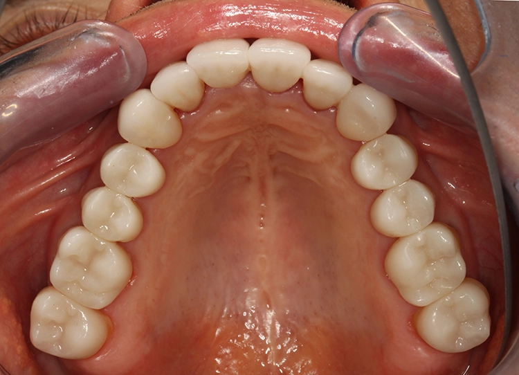 Die Präparation für die definitive Versorgung im Unterkiefer 37–46 mit Presskeramikveneers und -teilkronen wurden durch Abdrucknahme, Zentrikbissnahme und Gesichtsbogenübertragung vorbereitet. Die Anproben und die definitive Eingliederung erfolgten in den Folgesitzungen. Für die definitive Versorgung im Oberkiefer 17–27 durch Presskeramikveneers und -teilkronen erfolgte ebenfalls Abdrucknahme, Zentrikbissnahme, Gesichtsbogenübertragung, Anproben und die definitive Eingliederung in den Folgesitzungen. Nach der erfolgten Vorbehandlung stellten sich alle für die definitive Versorgung geplanten Zähne als sicher erhaltungswürdig dar.