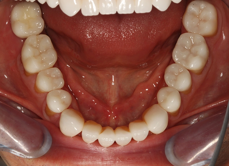 Die ursprüngliche anatomische Kauflächenstruktur wurde durch die prothetische Sanierung wiederhergestellt.