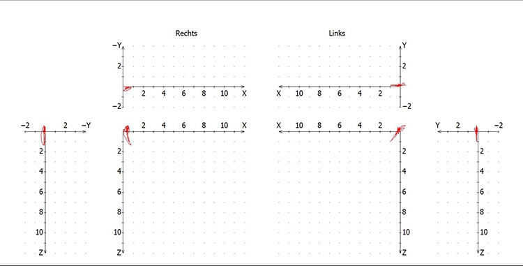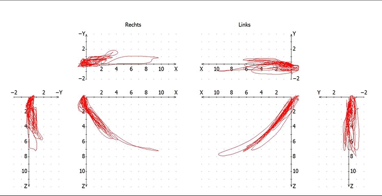 Ergänzend wurde 2019 im Rahmen einer Nachuntersuchung eine klinische und instrumentelle Funktionsanalyse durchgeführt, weil es beim Patienten an den Zähnen 45 und 46 sowohl zu Chippings und letztendlich auch zu endodontischen Komplikationen gekommen war. Zahn 46 musste 2014 aufgrund einer Kronen-/Wurzelfraktur entfernt und durch ein Implantat ersetzt werden. Die klinische Untersuchung wies auf ein Internal Derangement (Wilkes-Klassifikation Stadium III) im Sinne einer traumatisch bedingten partiellen Diskus-Kondylus-Verlagerung im rechten Kiefergelenk hin. In der Kondylografie (Abb. 24a bis c) zeigte sich ein distraktiver Vektor bis im Kaumuster sowie ein retrokranialer Vektor bei Bruxismusfunktion. Bei der mediotrusiven Bewegung links und Mundöffnung/Mundschluss (bei kranialer Manipulation) kam es zu einer partiellen Reposition sowie zu einer vollständigen Reposition bei Protrusion/Retrusion.