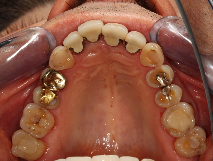 Erstbesuch und Erhebung der allgemeinmedizinischen Anamnese erfolgten am 17.02.2010. Es lagen keine Grunderkrankungen vor. Der Patient – Vegetarier mit hohem Rohkost-, Früchte- und Obstkonsum – ist am 16.08.51 geboren. Aufgrund einer missglückten endodontischen Behandlung an Zahn 47 wurde dieser im Oktober 2009 entfernt und 2 Monate später durch ein Einzelzahnimplantat ersetzt. Es stand nun die prothetische Versorgung mit einer implantatgetragenen Einzelzahnrestauration an. Der Patient hatte jedoch das Vertrauen in den bisherigen Behandler verloren, weshalb er sich entschied, unsere Praxis aufzusuchen. Er wies zudem darauf hin, dass er sich zunehmend am Erscheinungsbild der „abgekauten“ Bezahnung störe. Er war nach Aufklärung und eingehender Beratung an einer Gesamtsanierung seines Gebisses interessiert. Dabei legte er Wert auf eine ästhetisch-funktionelle und dauerhafte Verbesserung seiner Situation und stand einer notwendigen umfangreichen ästhetisch-rekonstruktiven Rehabilitation aufgeschlossen gegenüber.