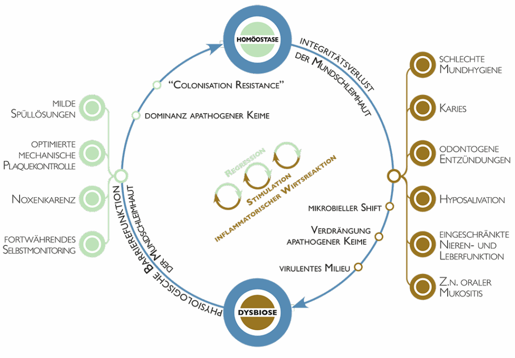 Der Zustand oraler Gesundheit wird als Gleichgewicht zwischen Wirt und oralem Mikrobiom in einer sogenannten Homöostase angesehen. Eine mikrobielle Homöostase schützt vor Kolonisierung mit exogenen und oft pathogenen Mikroorganismen (colonisation resistance), fördert die normale Entwicklung physiologischer und immunologischer Prozesse und trägt auch darüber hinaus zur systemischen Gesundheit des Wirtes bei [11]. Demgegenüber kann eine Störung der mikrobiellen Homöostase durch veränderte intrinsische und extrinsische Faktoren zu einer mikrobiellen Dysbiose durch selektive Begünstigung potenziell pathogener Mikroorganismen führen – es entstehen Nischen mit virulentem Milieu.