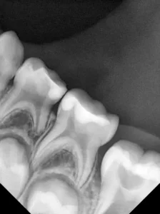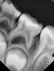 Das fünfjährige Mädchen stellte sich 2017 zur jährlichen Routinekontrolle vor. Im Rahmen der Untersuchung wurden Röntgenaufnahmen der Milchmolaren gemacht (Abb. 2). Der klinische und radiologische Befund der vor uns früher gelegten Kompositfüllungen war gut, es wurde allerdings eine PEIR an den noch nicht durchgebrochenen ersten bleibenden Molaren festgestellt (Abb. 2). Den Eltern wurde empfohlen, sich unverzüglich bei Beginn des Durchbruchs der ersten Molaren erneut zur Behandlung vorzustellen. Ein Jahr später erschien die junge Patientin schmerzfrei zur Kontrolle. Der Zahn 36 war noch teilweise mit Gingiva bedeckt. Auf einer neuen Röntgenaufnahme (Abb. 1) wurde die PEIR-Läsion mit unveränderter Größe in pulpanahen Bereichen bestätigt (Grad 3 der Läsion nach Seow). Der Zahnschmelz sah intakt aus, es konnte kein pathologischer periapikaler Befund bei den noch nicht ausgewachsenen Zahnwurzeln festgestellt werden. Daraufhin wurden die verschiedenen Behandlungsmöglichkeiten von Fissurenversiegelung bis Vitalerhaltung der Zahnpulpa mit den Eltern des Kindes besprochen.