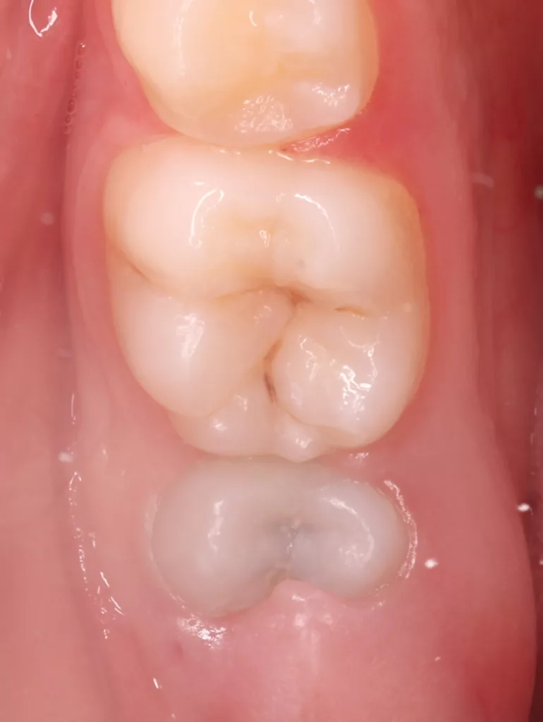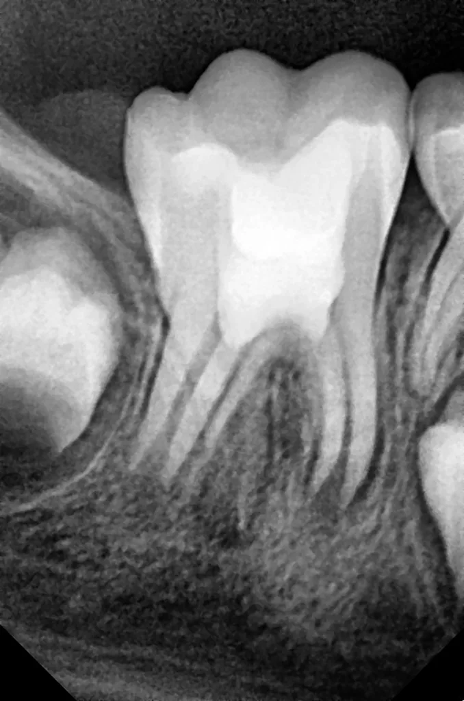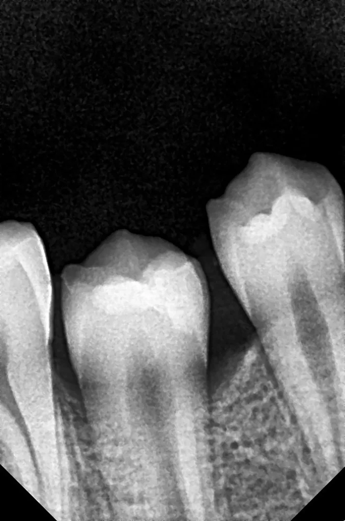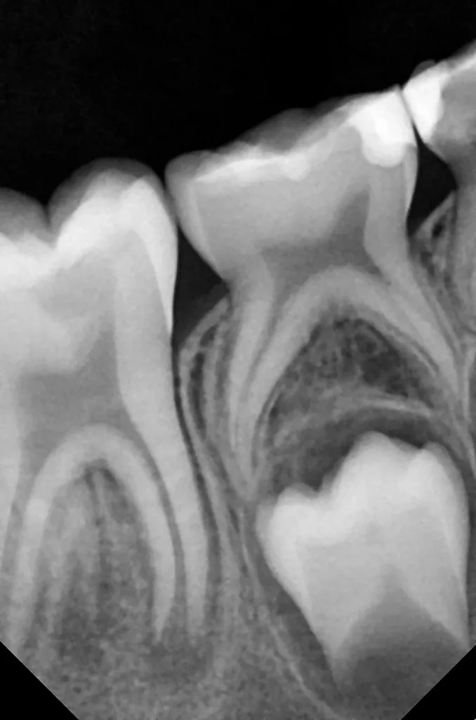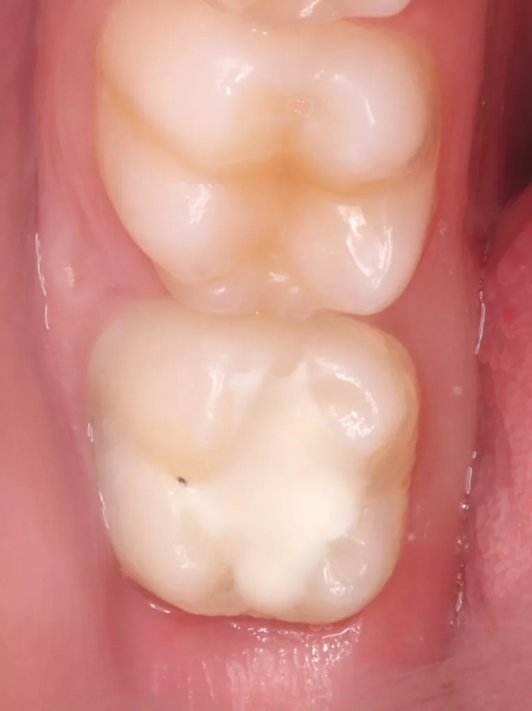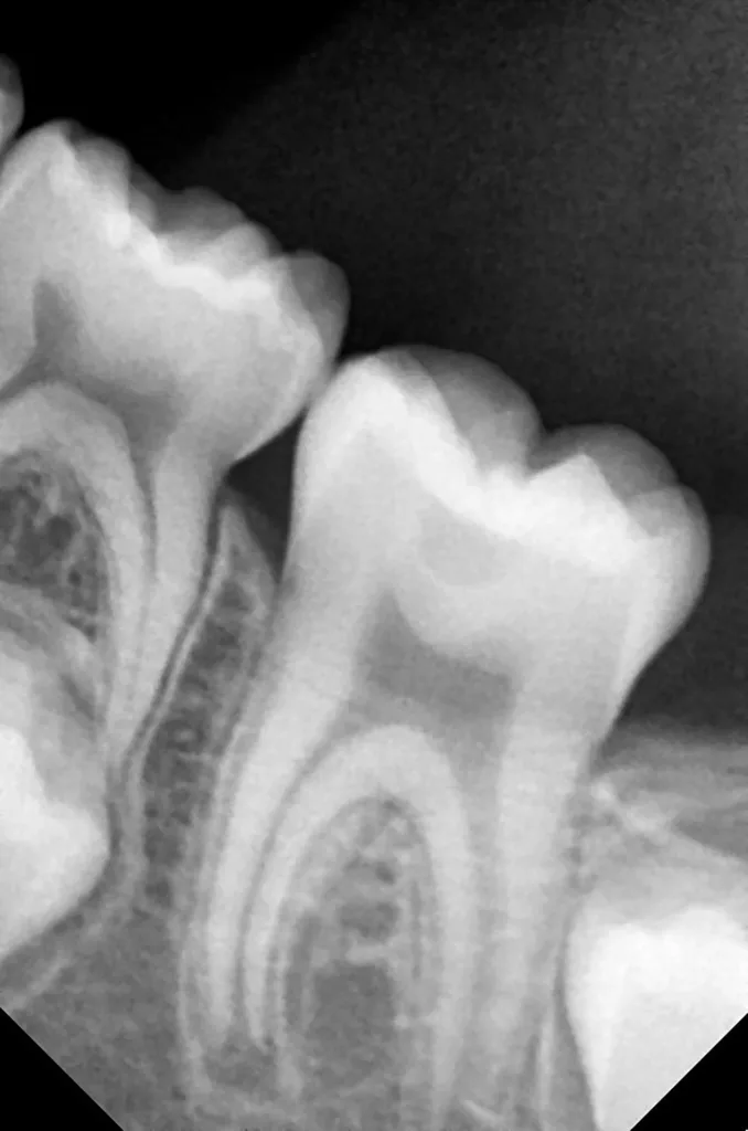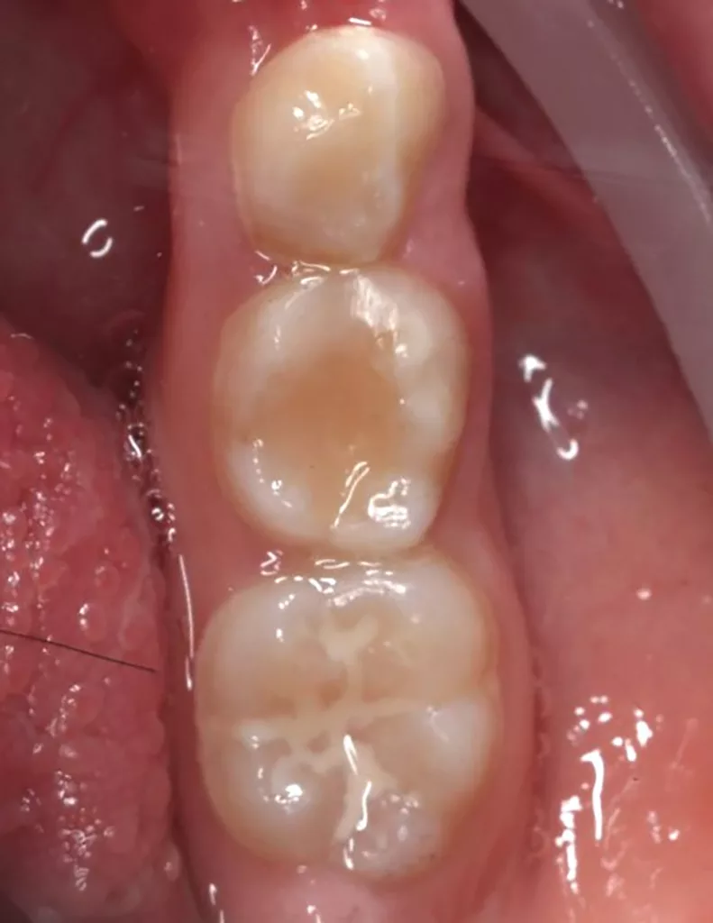 Das fünfjährige Mädchen stellte sich 2017 zur jährlichen Routinekontrolle vor. Im Rahmen der Untersuchung wurden Röntgenaufnahmen der Milchmolaren gemacht (Abb. 2). Der klinische und radiologische Befund der vor uns früher gelegten Kompositfüllungen war gut, es wurde allerdings eine PEIR an den noch nicht durchgebrochenen ersten bleibenden Molaren festgestellt (Abb. 2). Den Eltern wurde empfohlen, sich unverzüglich bei Beginn des Durchbruchs der ersten Molaren erneut zur Behandlung vorzustellen. Ein Jahr später erschien die junge Patientin schmerzfrei zur Kontrolle. Der Zahn 36 war noch teilweise mit Gingiva bedeckt. Auf einer neuen Röntgenaufnahme (Abb. 1) wurde die PEIR-Läsion mit unveränderter Größe in pulpanahen Bereichen bestätigt (Grad 3 der Läsion nach Seow). Der Zahnschmelz sah intakt aus, es konnte kein pathologischer periapikaler Befund bei den noch nicht ausgewachsenen Zahnwurzeln festgestellt werden. Daraufhin wurden die verschiedenen Behandlungsmöglichkeiten von Fissurenversiegelung bis Vitalerhaltung der Zahnpulpa mit den Eltern des Kindes besprochen.