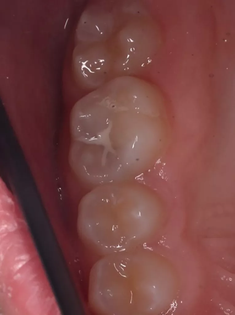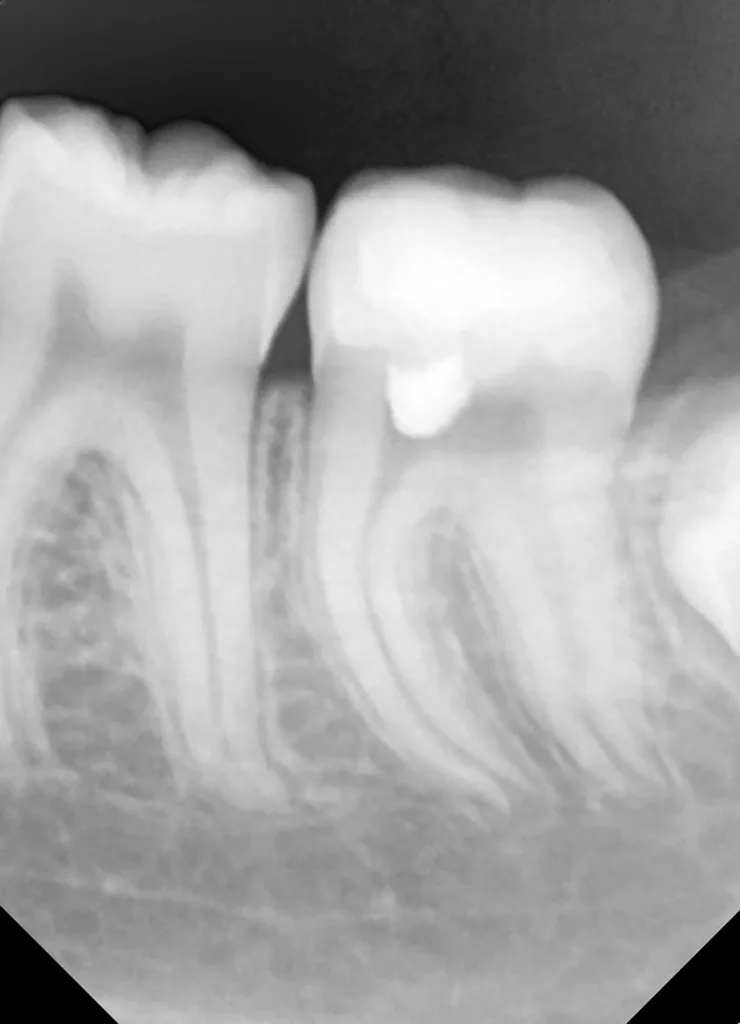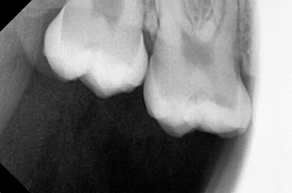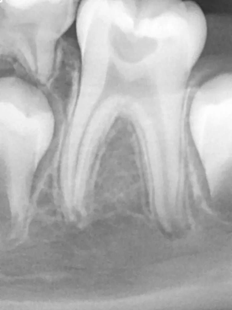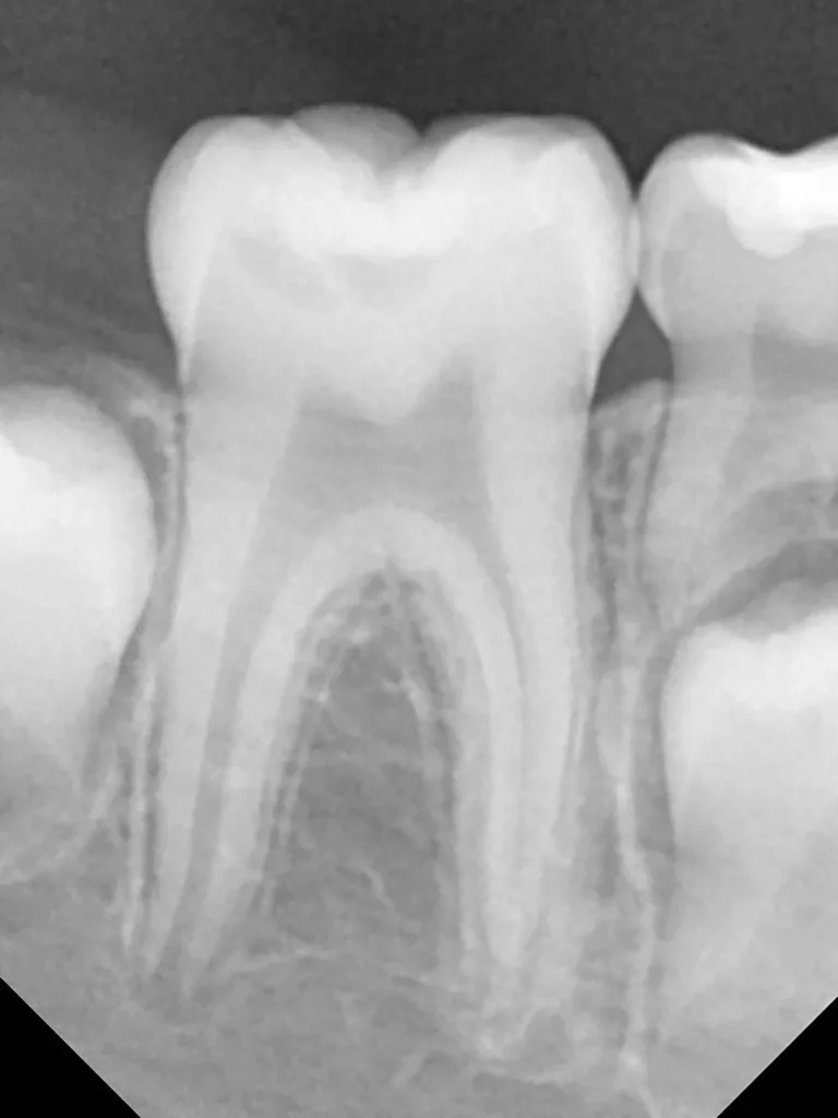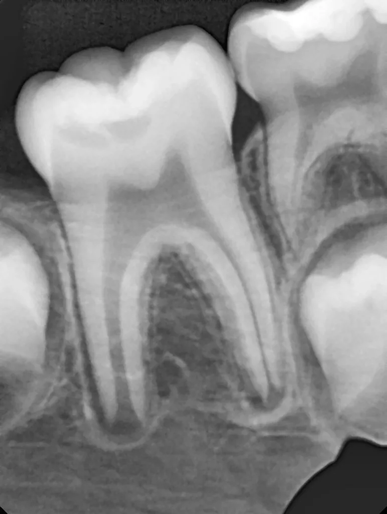 Das fünfjährige Mädchen stellte sich 2017 zur jährlichen Routinekontrolle vor. Im Rahmen der Untersuchung wurden Röntgenaufnahmen der Milchmolaren gemacht (Abb. 2). Der klinische und radiologische Befund der vor uns früher gelegten Kompositfüllungen war gut, es wurde allerdings eine PEIR an den noch nicht durchgebrochenen ersten bleibenden Molaren festgestellt (Abb. 2). Den Eltern wurde empfohlen, sich unverzüglich bei Beginn des Durchbruchs der ersten Molaren erneut zur Behandlung vorzustellen. Ein Jahr später erschien die junge Patientin schmerzfrei zur Kontrolle. Der Zahn 36 war noch teilweise mit Gingiva bedeckt. Auf einer neuen Röntgenaufnahme (Abb. 1) wurde die PEIR-Läsion mit unveränderter Größe in pulpanahen Bereichen bestätigt (Grad 3 der Läsion nach Seow). Der Zahnschmelz sah intakt aus, es konnte kein pathologischer periapikaler Befund bei den noch nicht ausgewachsenen Zahnwurzeln festgestellt werden. Daraufhin wurden die verschiedenen Behandlungsmöglichkeiten von Fissurenversiegelung bis Vitalerhaltung der Zahnpulpa mit den Eltern des Kindes besprochen.