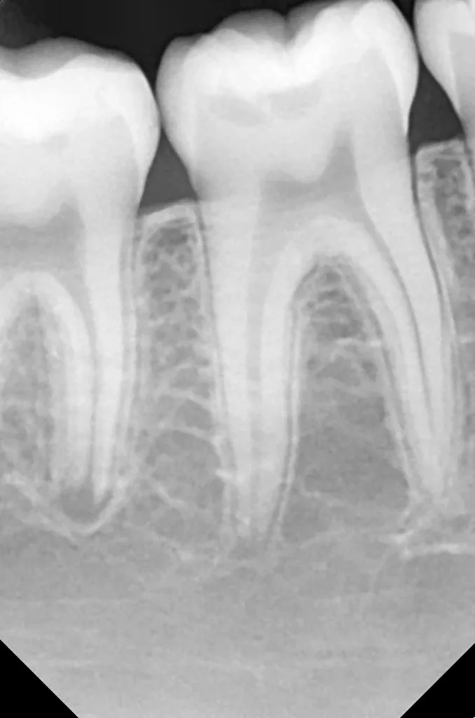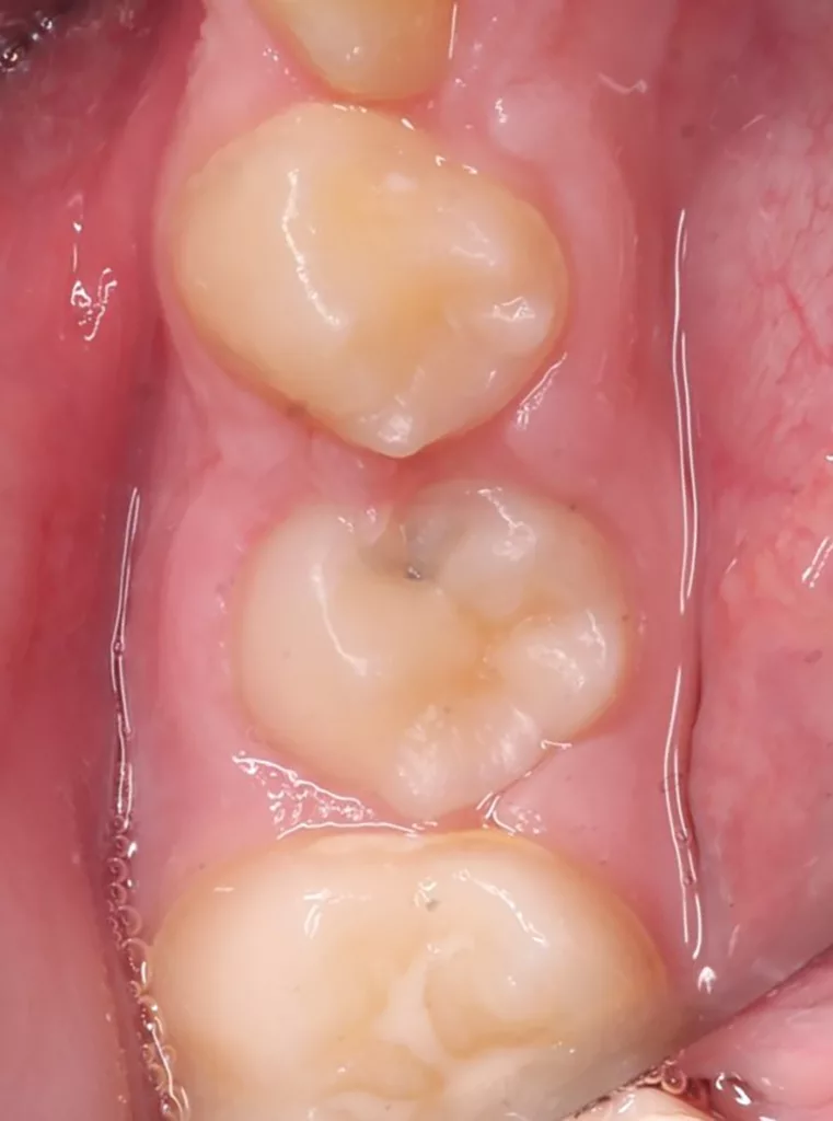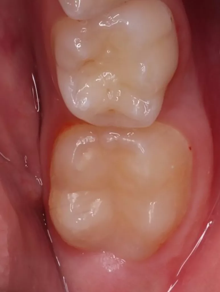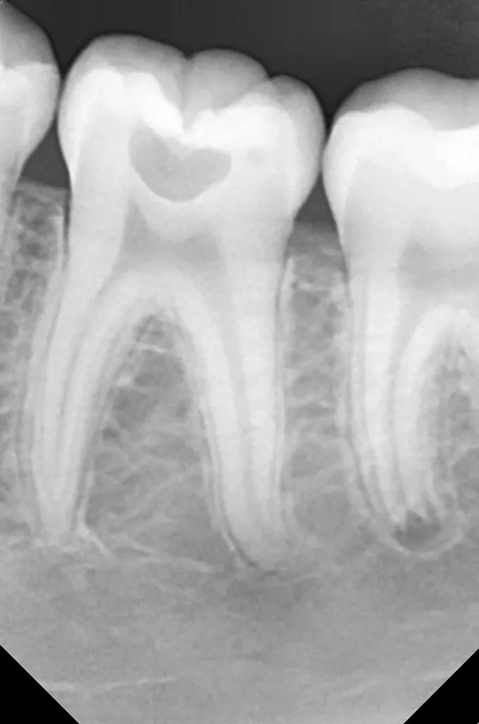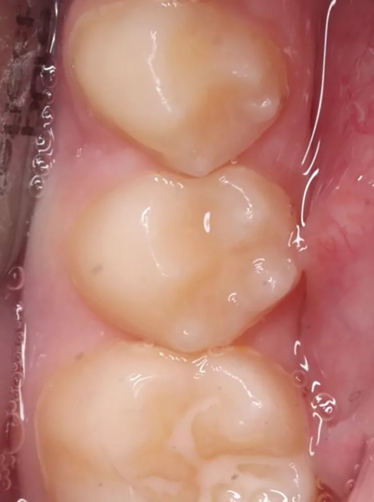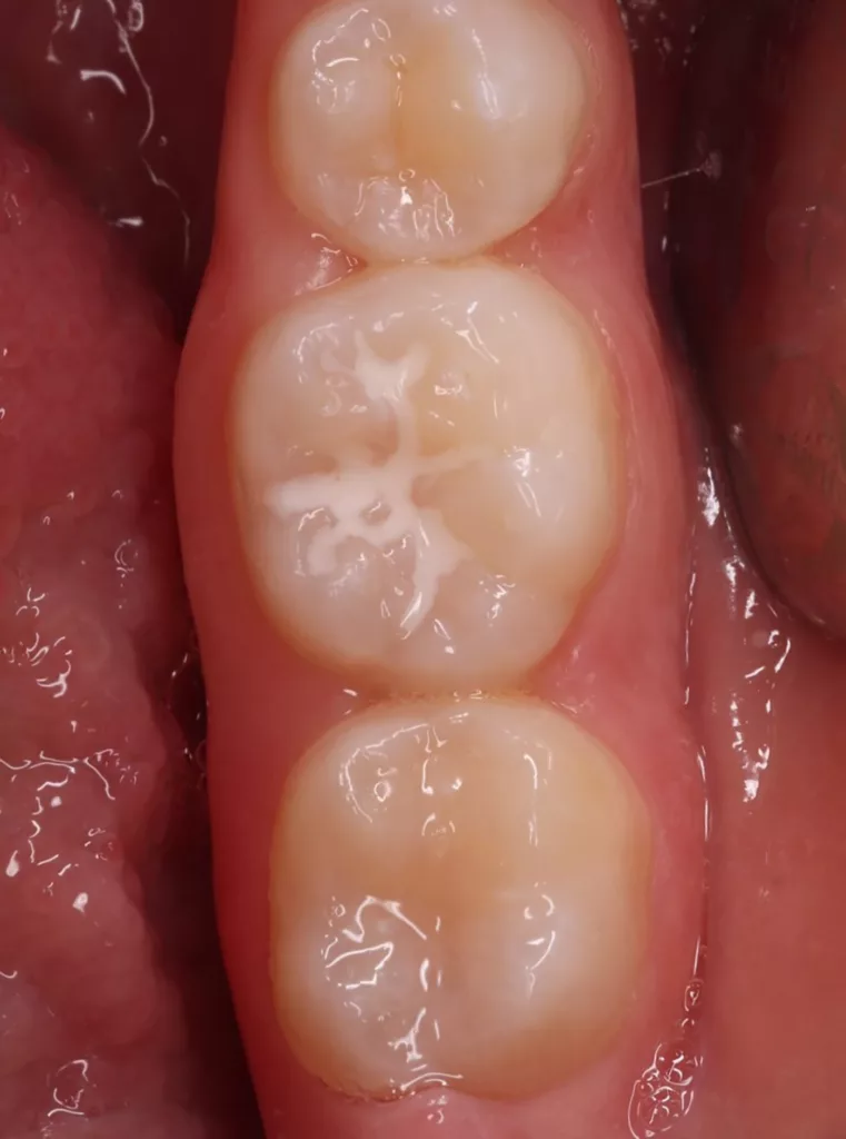 Das fünfjährige Mädchen stellte sich 2017 zur jährlichen Routinekontrolle vor. Im Rahmen der Untersuchung wurden Röntgenaufnahmen der Milchmolaren gemacht (Abb. 2). Der klinische und radiologische Befund der vor uns früher gelegten Kompositfüllungen war gut, es wurde allerdings eine PEIR an den noch nicht durchgebrochenen ersten bleibenden Molaren festgestellt (Abb. 2). Den Eltern wurde empfohlen, sich unverzüglich bei Beginn des Durchbruchs der ersten Molaren erneut zur Behandlung vorzustellen. Ein Jahr später erschien die junge Patientin schmerzfrei zur Kontrolle. Der Zahn 36 war noch teilweise mit Gingiva bedeckt. Auf einer neuen Röntgenaufnahme (Abb. 1) wurde die PEIR-Läsion mit unveränderter Größe in pulpanahen Bereichen bestätigt (Grad 3 der Läsion nach Seow). Der Zahnschmelz sah intakt aus, es konnte kein pathologischer periapikaler Befund bei den noch nicht ausgewachsenen Zahnwurzeln festgestellt werden. Daraufhin wurden die verschiedenen Behandlungsmöglichkeiten von Fissurenversiegelung bis Vitalerhaltung der Zahnpulpa mit den Eltern des Kindes besprochen.