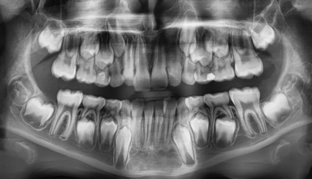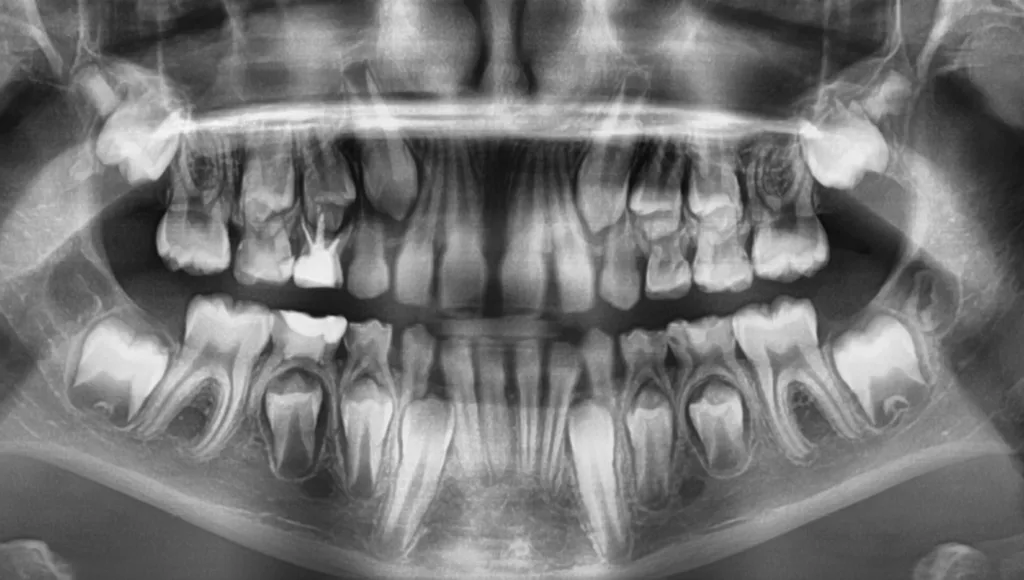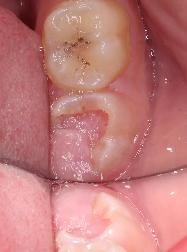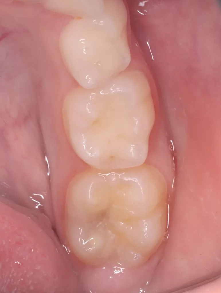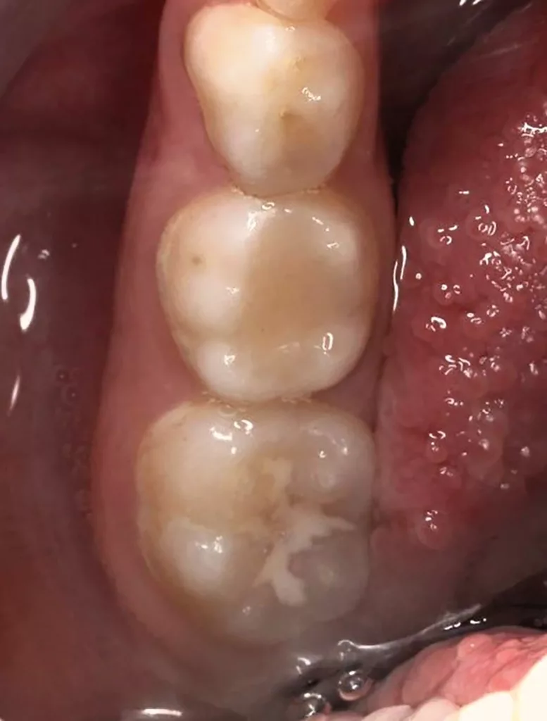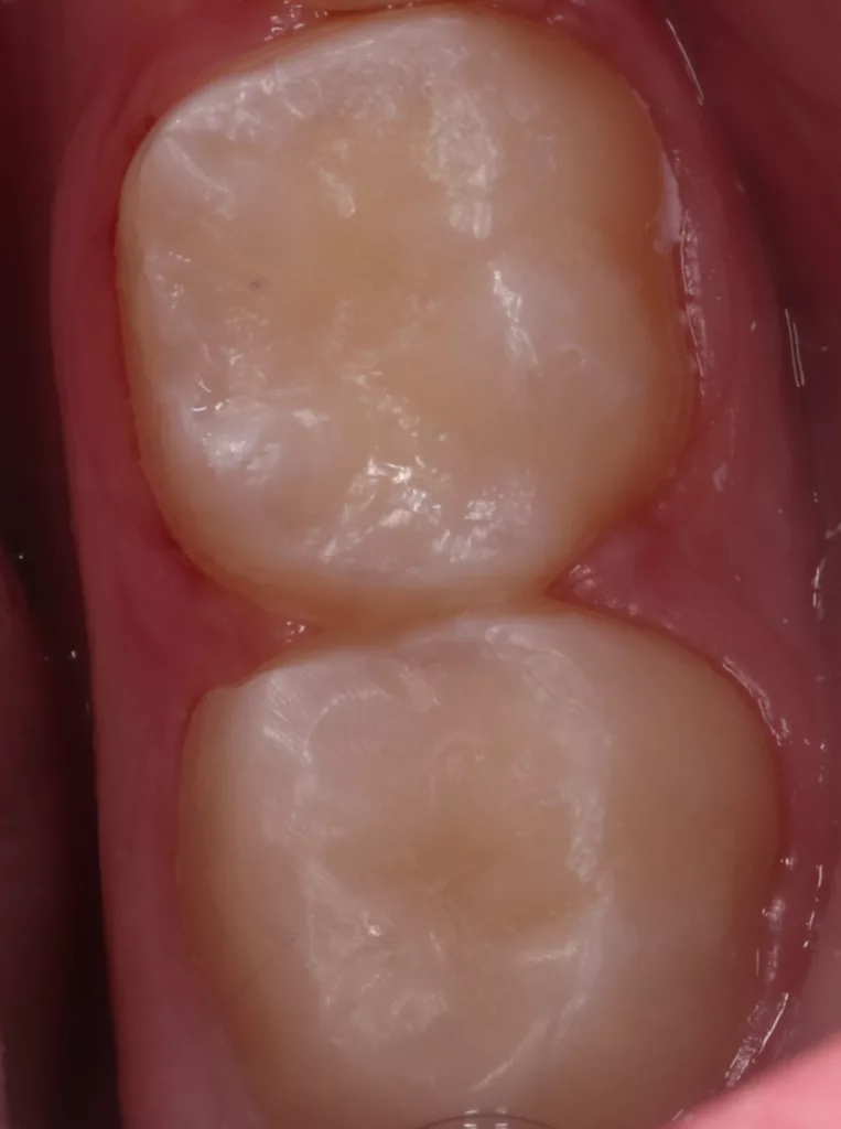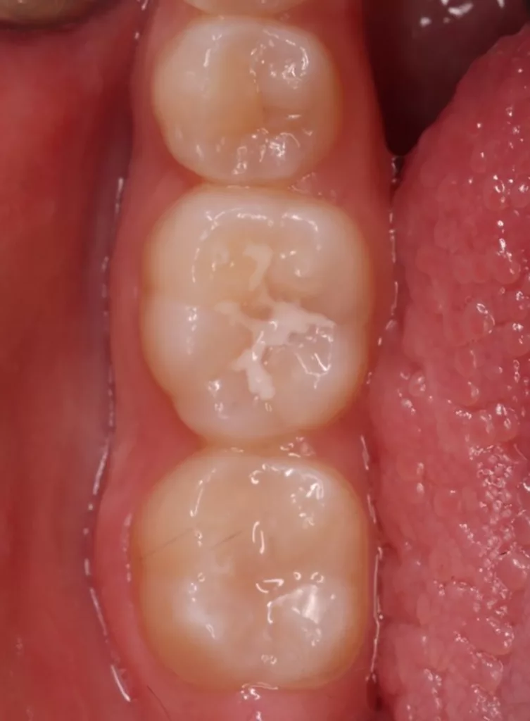 Das fünfjährige Mädchen stellte sich 2017 zur jährlichen Routinekontrolle vor. Im Rahmen der Untersuchung wurden Röntgenaufnahmen der Milchmolaren gemacht (Abb. 2). Der klinische und radiologische Befund der vor uns früher gelegten Kompositfüllungen war gut, es wurde allerdings eine PEIR an den noch nicht durchgebrochenen ersten bleibenden Molaren festgestellt (Abb. 2). Den Eltern wurde empfohlen, sich unverzüglich bei Beginn des Durchbruchs der ersten Molaren erneut zur Behandlung vorzustellen. Ein Jahr später erschien die junge Patientin schmerzfrei zur Kontrolle. Der Zahn 36 war noch teilweise mit Gingiva bedeckt. Auf einer neuen Röntgenaufnahme (Abb. 1) wurde die PEIR-Läsion mit unveränderter Größe in pulpanahen Bereichen bestätigt (Grad 3 der Läsion nach Seow). Der Zahnschmelz sah intakt aus, es konnte kein pathologischer periapikaler Befund bei den noch nicht ausgewachsenen Zahnwurzeln festgestellt werden. Daraufhin wurden die verschiedenen Behandlungsmöglichkeiten von Fissurenversiegelung bis Vitalerhaltung der Zahnpulpa mit den Eltern des Kindes besprochen.
