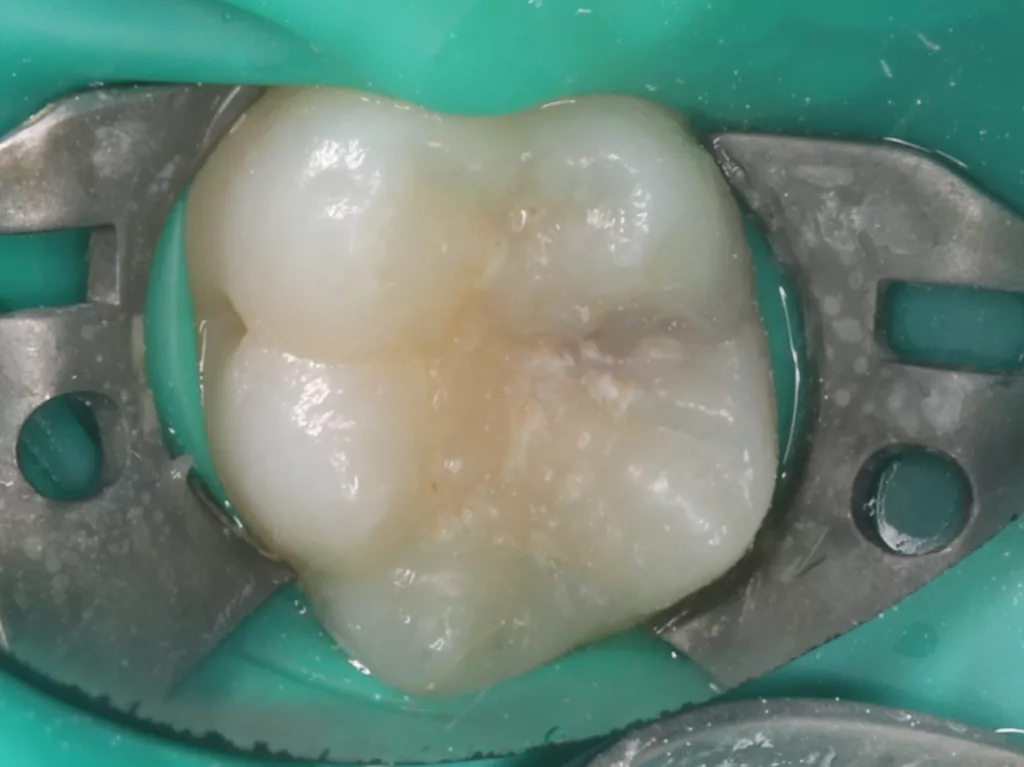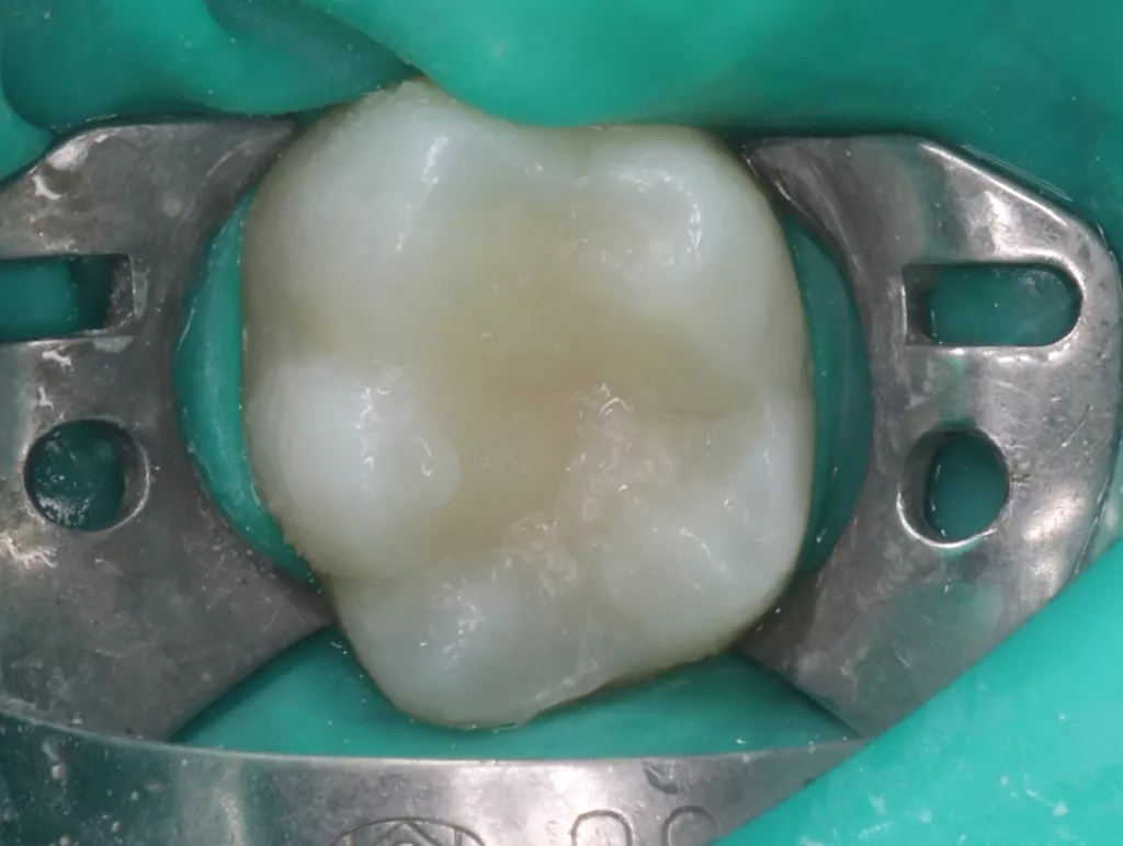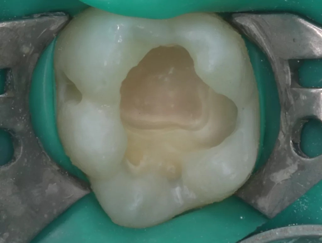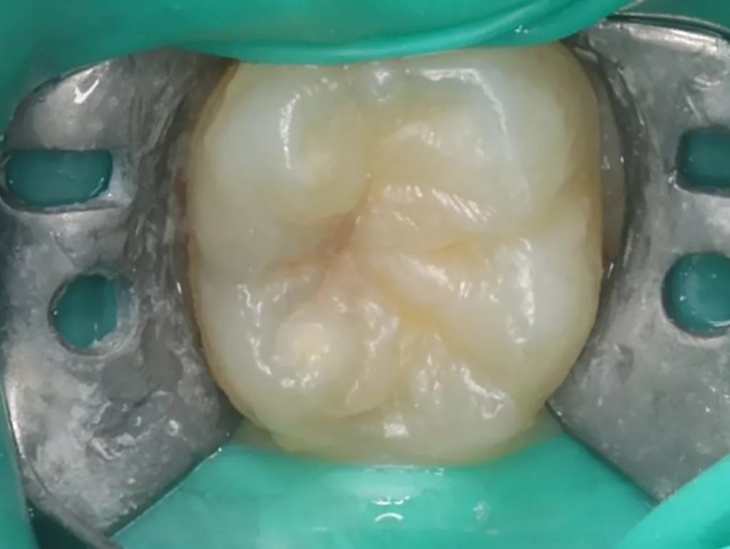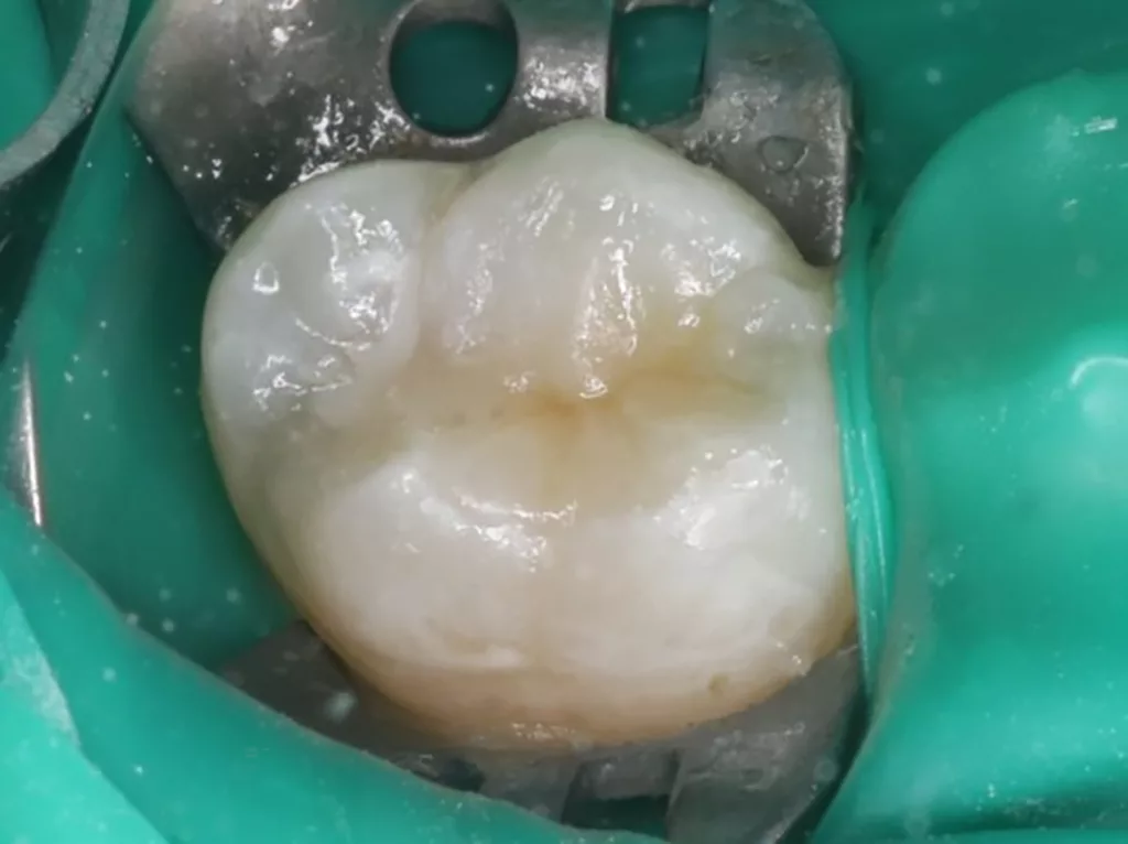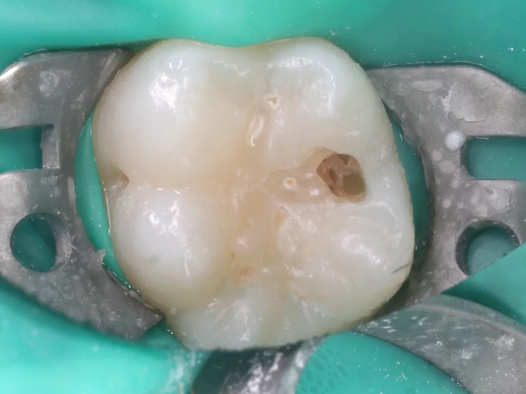 Das siebenjährige Mädchen wurde von einer Kollegin zur Behandlung einer atypischen intrakoronalen Aufhellung im Kronenbereich des nach Durchbruch befindlichen symptomatischen Zahnes 46 überwiesen (Abb. 20). Anamnestisch bestanden seit zwei Tagen kurzintervallige Spontan- und Nachtschmerzen, die mit Ibuprofen 40 mg/ml Kindersirup behandelt wurden. Das Röntgenbild zeigte einen umfangreichen runden Dentindefekt unter intaktem Zahnschmelz, der bis in das Pulpakavum reichte. Daraus ergab sich die Verdachtsdiagnose PEIR des Zahnes 46 (Grad 3 der Läsion nach Seow) in Kombination mit einer akuten Pulpitis. Nach Leitungsanästhesie am Foramen mandibulae mit Septanest 1/100 000 (Septodont, Frankreich) und STA-System (Milstone Scientific, USA) konnte der Zahn mithilfe von Kofferdam (Klammer U67, KSK Dentech, Japan) gut isoliert werden (Abb. 21). Um die ursprüngliche Zahnanatomie zu imitieren, wurde ein Okklusalstempel aus dem flüssigen Kofferdam OpalDam (Ultradent, Frankreich) und einem Microbrushapplikator angefertigt.
