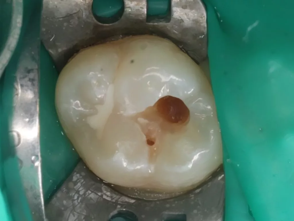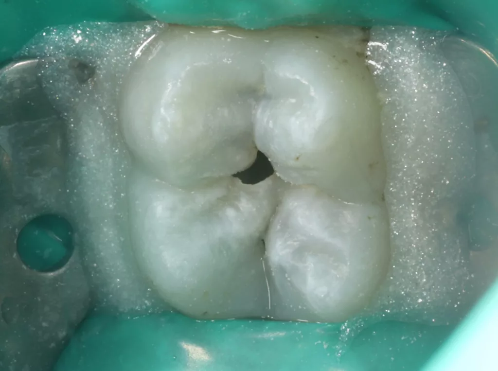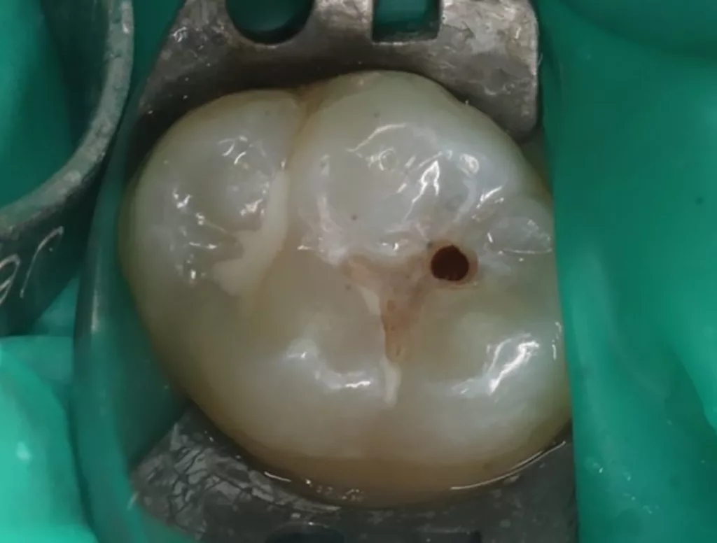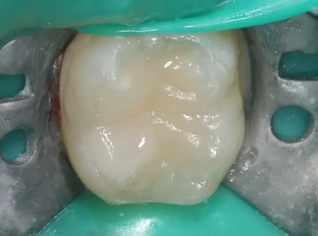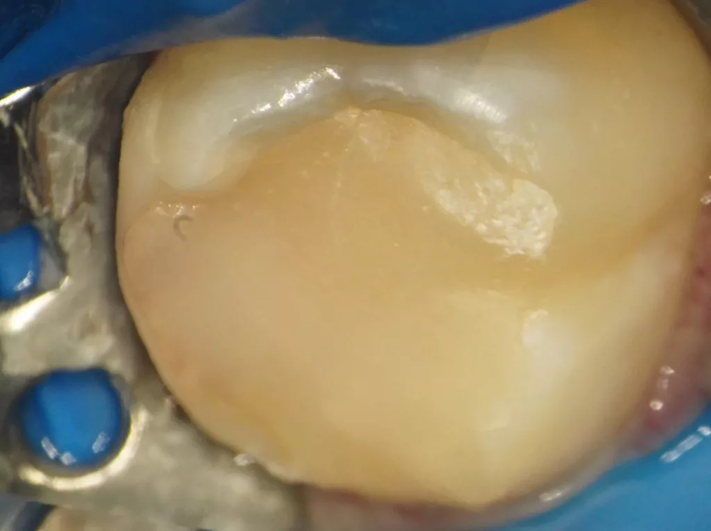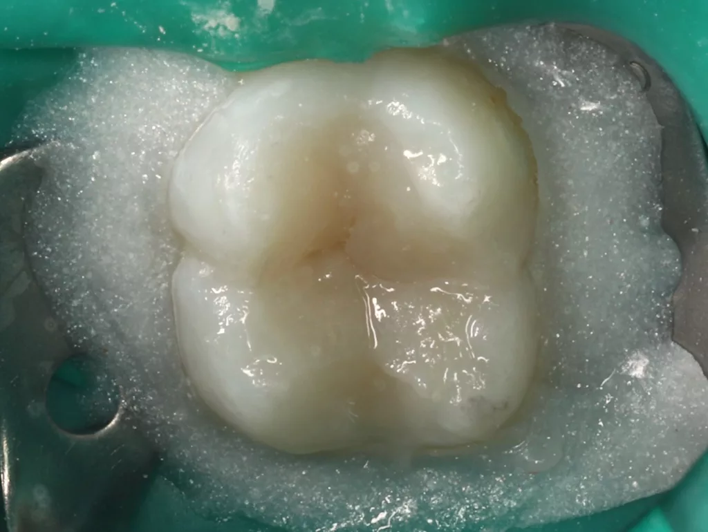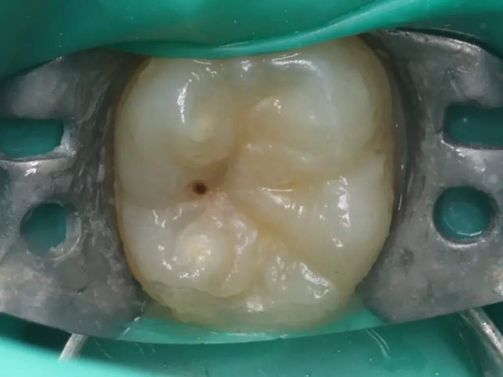 Das siebenjährige Mädchen wurde von einer Kollegin zur Behandlung einer atypischen intrakoronalen Aufhellung im Kronenbereich des nach Durchbruch befindlichen symptomatischen Zahnes 46 überwiesen (Abb. 20). Anamnestisch bestanden seit zwei Tagen kurzintervallige Spontan- und Nachtschmerzen, die mit Ibuprofen 40 mg/ml Kindersirup behandelt wurden. Das Röntgenbild zeigte einen umfangreichen runden Dentindefekt unter intaktem Zahnschmelz, der bis in das Pulpakavum reichte. Daraus ergab sich die Verdachtsdiagnose PEIR des Zahnes 46 (Grad 3 der Läsion nach Seow) in Kombination mit einer akuten Pulpitis. Nach Leitungsanästhesie am Foramen mandibulae mit Septanest 1/100 000 (Septodont, Frankreich) und STA-System (Milstone Scientific, USA) konnte der Zahn mithilfe von Kofferdam (Klammer U67, KSK Dentech, Japan) gut isoliert werden (Abb. 21). Um die ursprüngliche Zahnanatomie zu imitieren, wurde ein Okklusalstempel aus dem flüssigen Kofferdam OpalDam (Ultradent, Frankreich) und einem Microbrushapplikator angefertigt.