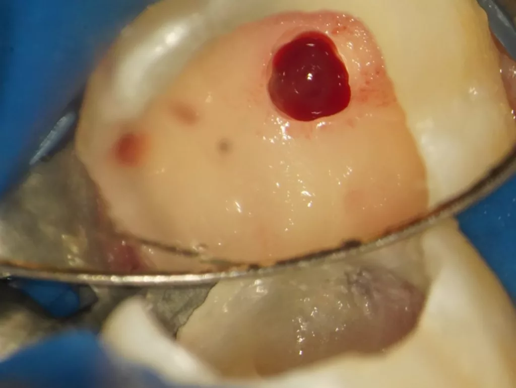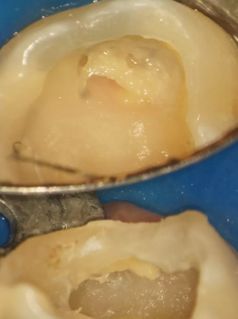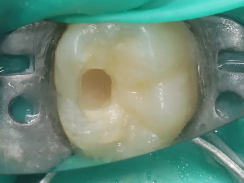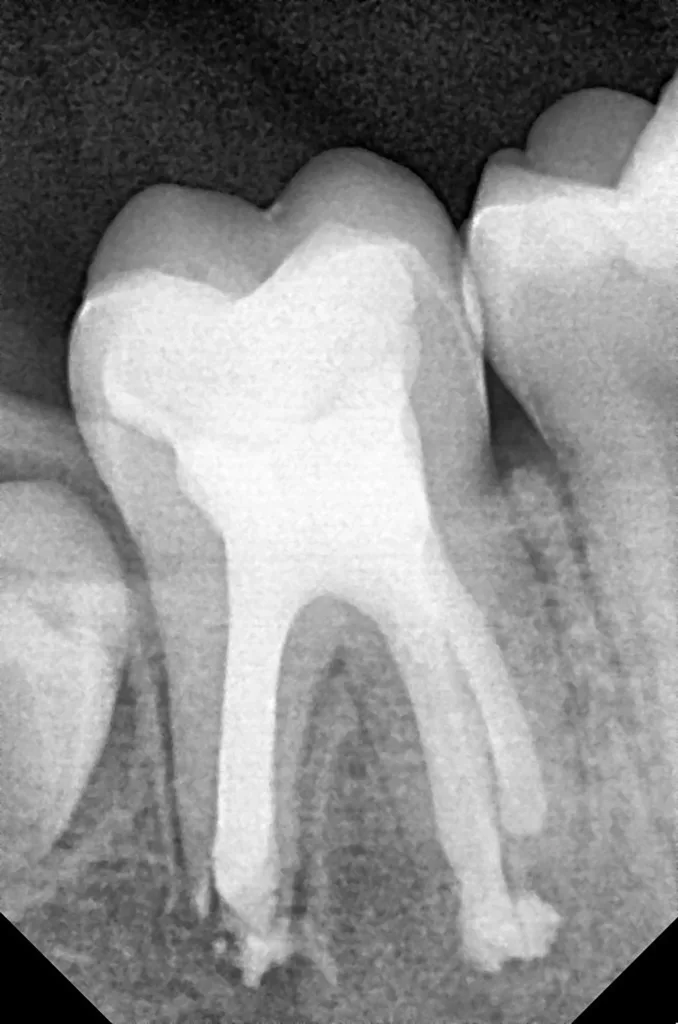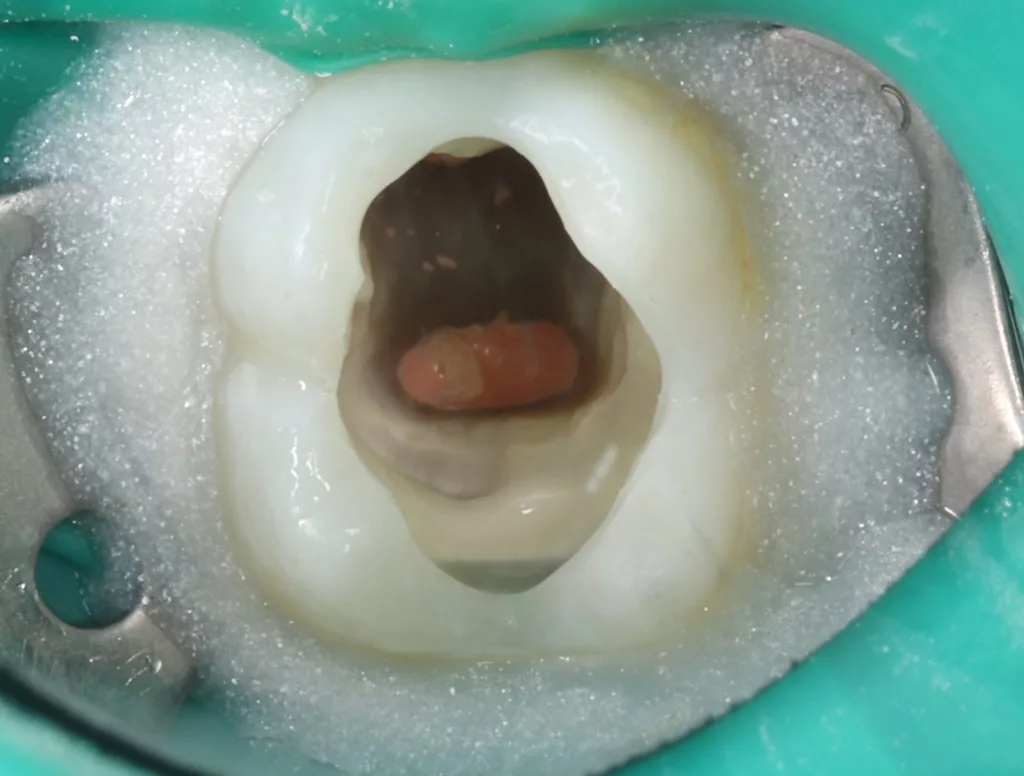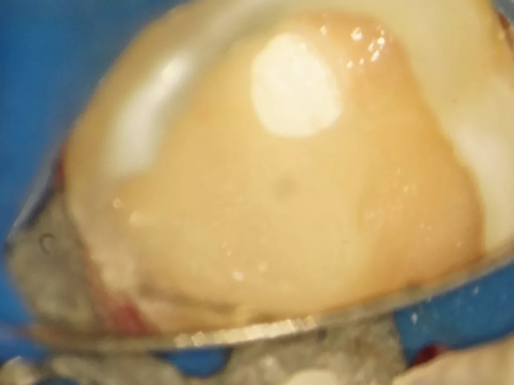 Unter Leitungsanästhesie am Foramen mandibulae mit Septanest 1/100 000 (Septodont, Frankreich) wurde auch hier Kofferdam gelegt (erneut die Klammer U67 (KSK Dentech, Japan) (Abb. 32). Nach Entfernung der temporären Füllung wurde intrakoronal in zahlreichen Lücken und Unterschnitten blasses nekrotisches Weichgewebe entdeckt (Abb. 34 und 35). Um das Weichgewebe zu entfernen, wurde ein Rosenbohrer verwendet und ausgiebig mit 5,25%igem NaOCl gespült. Während der Spülung war die wenig sichtbare Blutung in verschiedenen Arealen und unter anderem an der Schmelz-Dentin-Grenze zu beobachten (Abb. 36). Nach schrittweiser Entfernung des z.T. nekrotischen Weichgewebes mit Rosenbohrern und einem Löffelexkavator wurde intaktes hartes helles Dentin vorgefunden. In der Abbildung 37 ist eine punktförmige Perforation in Richtung des mesiobukkalen Pulpahornes zu sehen. Daraufhin wurde eine partielle Pulpotomie in einer Ausdehnung von ca. 4 mm durchgeführt, bis zum Erreichen einer moderat blutenden, vitalen Pulpa (Abb. 38). Die Pulpa wurde mit 1%igem NaOCl und physiologischer Kochsalzlösung gereinigt. Nach vierminütiger Applikation eines sterilen nassen Wattepellets konnte eine physiologische Blutstillung erreicht werden. Nach finaler Spülung mit physiologischer Kochsalzlösung erfolgte die Abdeckung der nicht mehr blutenden Pulpa mit Kalzium-Aluminiumsilikat-Paste BC UNIVERSAL RRM (FKG Dentaire, Schweiz) (Abb. 39). Nach der adhäsiven koronalen Restauration mit Estelite ASTERIA OCE, A2B und Universal Flow AO2 (Tokuyama, Japan) (Abb. 41) wurde eine abschließende Röntgenkontrollaufnahme angefertigt, um die Platzierung des BC UNIVERSAL RRM zu überprüfen (Abb. 40).