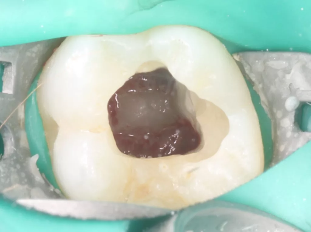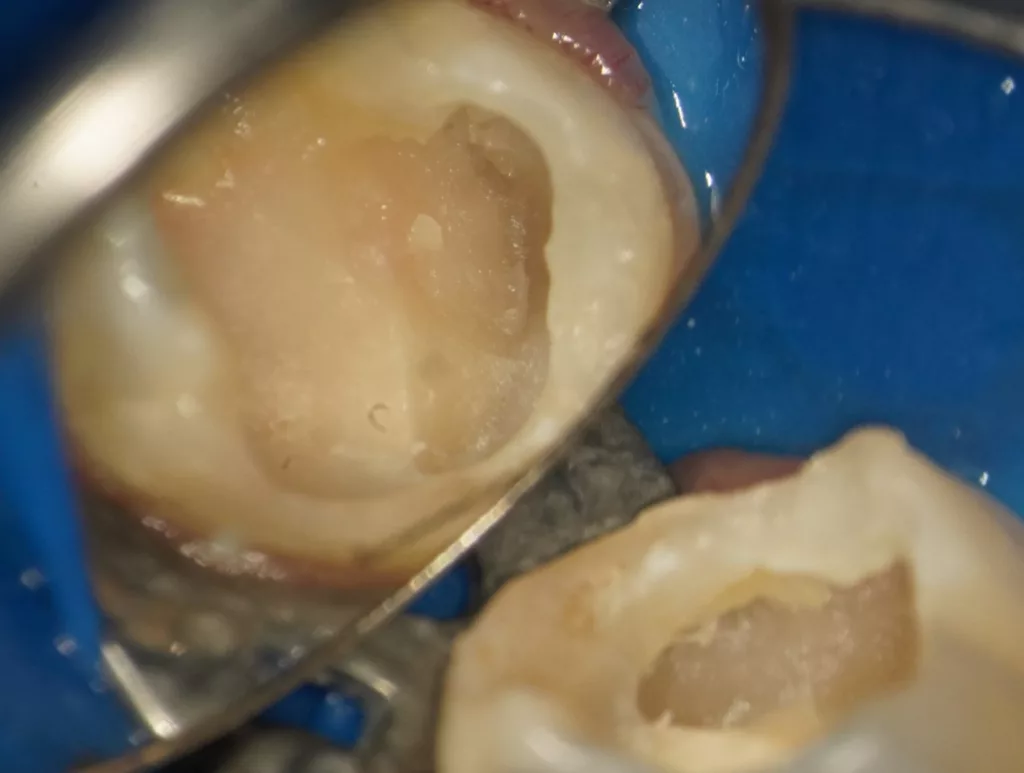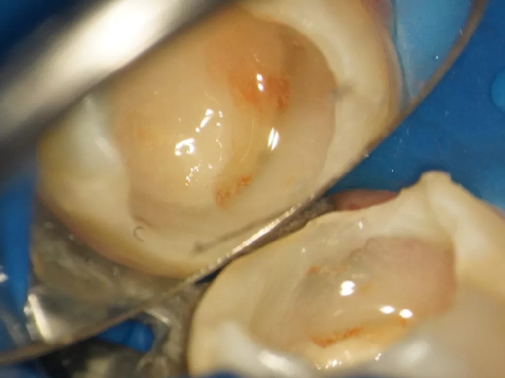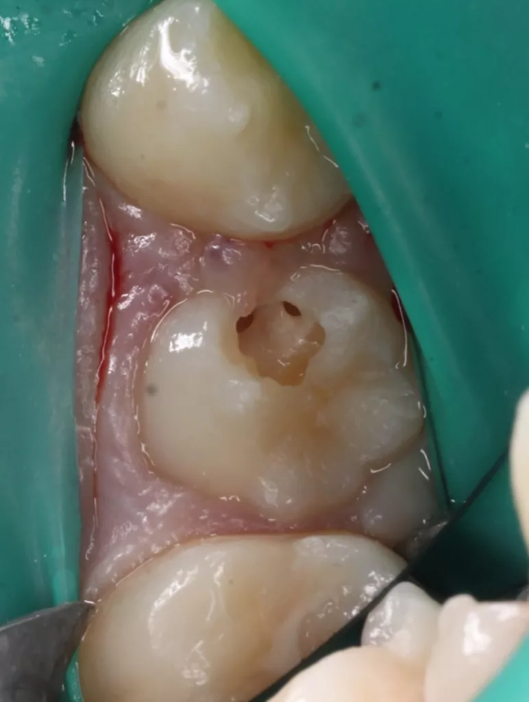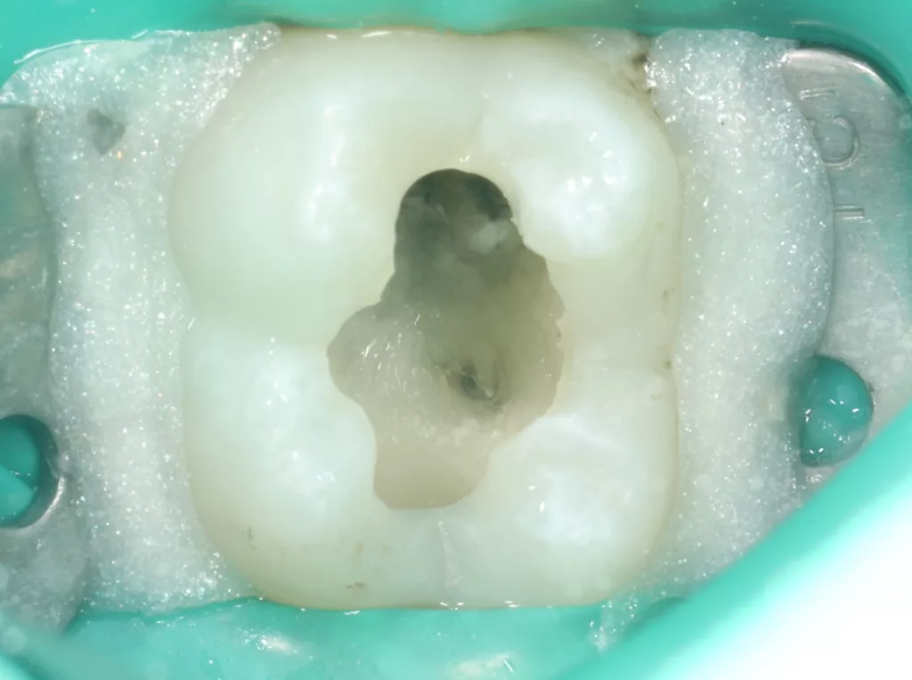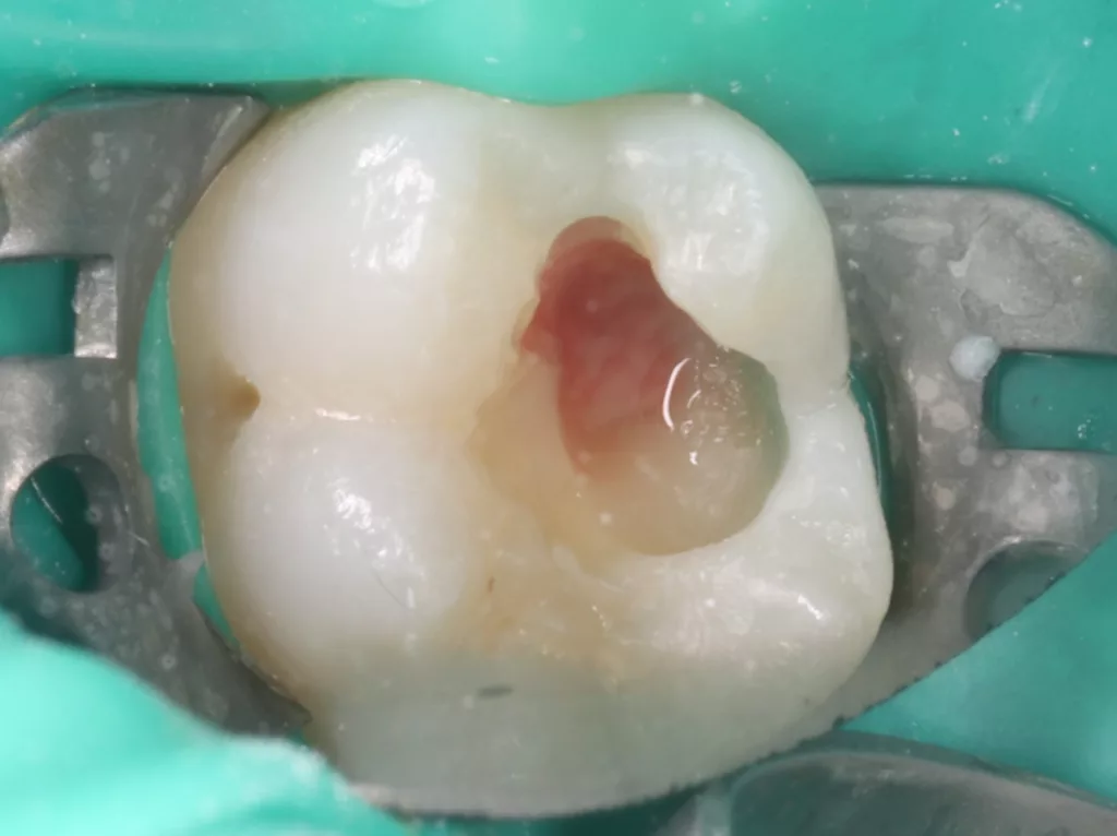 Unter Leitungsanästhesie am Foramen mandibulae mit Septanest 1/100 000 (Septodont, Frankreich) wurde auch hier Kofferdam gelegt (erneut die Klammer U67 (KSK Dentech, Japan) (Abb. 32). Nach Entfernung der temporären Füllung wurde intrakoronal in zahlreichen Lücken und Unterschnitten blasses nekrotisches Weichgewebe entdeckt (Abb. 34 und 35). Um das Weichgewebe zu entfernen, wurde ein Rosenbohrer verwendet und ausgiebig mit 5,25%igem NaOCl gespült. Während der Spülung war die wenig sichtbare Blutung in verschiedenen Arealen und unter anderem an der Schmelz-Dentin-Grenze zu beobachten (Abb. 36). Nach schrittweiser Entfernung des z.T. nekrotischen Weichgewebes mit Rosenbohrern und einem Löffelexkavator wurde intaktes hartes helles Dentin vorgefunden. In der Abbildung 37 ist eine punktförmige Perforation in Richtung des mesiobukkalen Pulpahornes zu sehen. Daraufhin wurde eine partielle Pulpotomie in einer Ausdehnung von ca. 4 mm durchgeführt, bis zum Erreichen einer moderat blutenden, vitalen Pulpa (Abb. 38). Die Pulpa wurde mit 1%igem NaOCl und physiologischer Kochsalzlösung gereinigt. Nach vierminütiger Applikation eines sterilen nassen Wattepellets konnte eine physiologische Blutstillung erreicht werden. Nach finaler Spülung mit physiologischer Kochsalzlösung erfolgte die Abdeckung der nicht mehr blutenden Pulpa mit Kalzium-Aluminiumsilikat-Paste BC UNIVERSAL RRM (FKG Dentaire, Schweiz) (Abb. 39). Nach der adhäsiven koronalen Restauration mit Estelite ASTERIA OCE, A2B und Universal Flow AO2 (Tokuyama, Japan) (Abb. 41) wurde eine abschließende Röntgenkontrollaufnahme angefertigt, um die Platzierung des BC UNIVERSAL RRM zu überprüfen (Abb. 40).