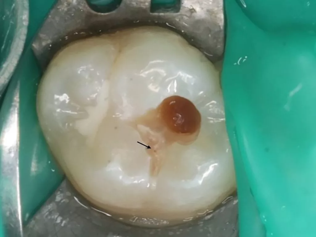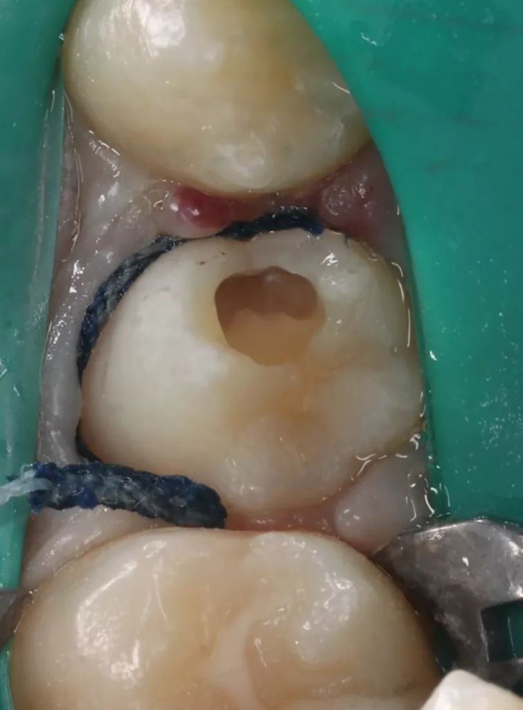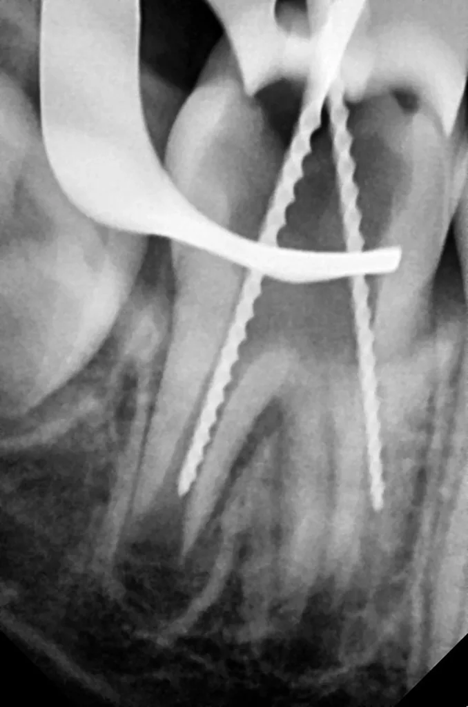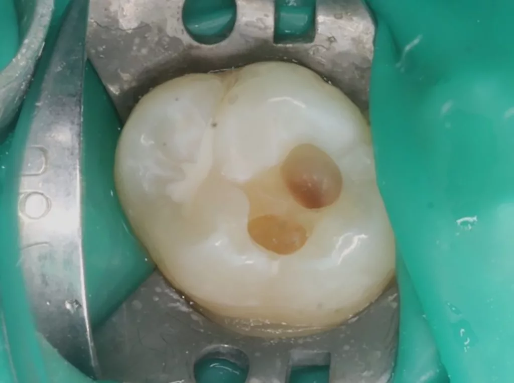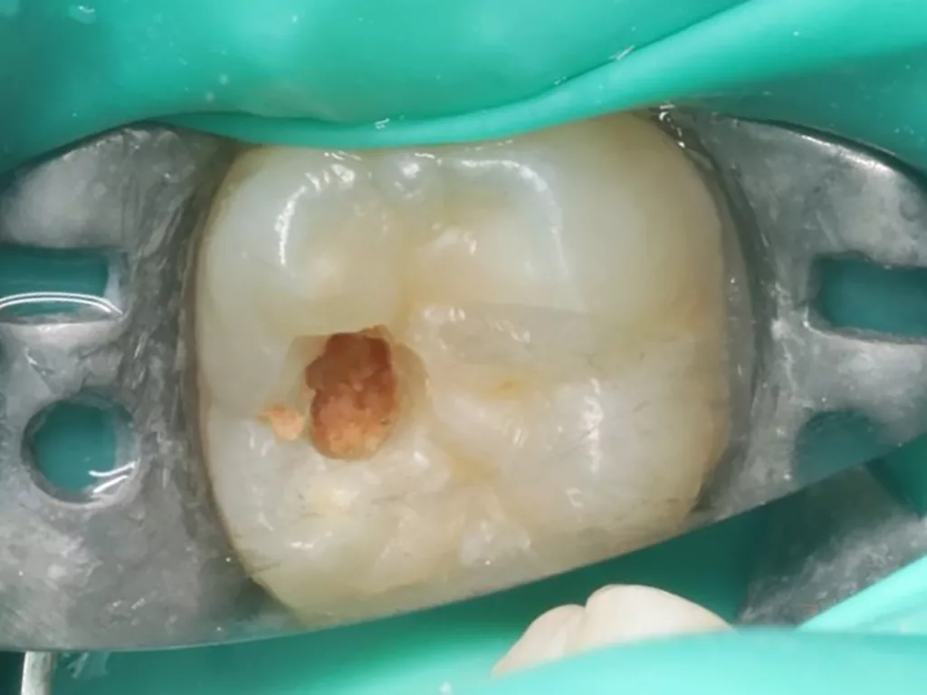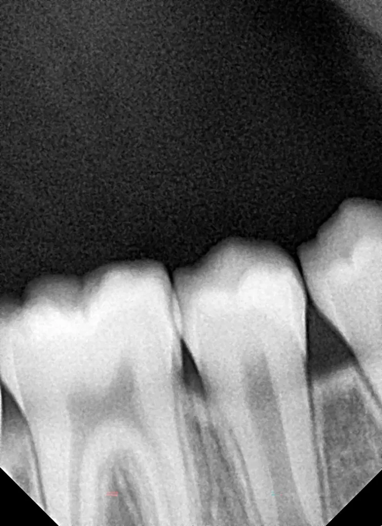Unter Leitungsanästhesie am Foramen mandibulae mit Septanest 1/100 000 (Septodont, Frankreich) wurde auch hier Kofferdam gelegt (erneut die Klammer U67 (KSK Dentech, Japan) (Abb. 32). Nach Entfernung der temporären Füllung wurde intrakoronal in zahlreichen Lücken und Unterschnitten blasses nekrotisches Weichgewebe entdeckt (Abb. 34 und 35). Um das Weichgewebe zu entfernen, wurde ein Rosenbohrer verwendet und ausgiebig mit 5,25%igem NaOCl gespült. Während der Spülung war die wenig sichtbare Blutung in verschiedenen Arealen und unter anderem an der Schmelz-Dentin-Grenze zu beobachten (Abb. 36). Nach schrittweiser Entfernung des z.T. nekrotischen Weichgewebes mit Rosenbohrern und einem Löffelexkavator wurde intaktes hartes helles Dentin vorgefunden. In der Abbildung 37 ist eine punktförmige Perforation in Richtung des mesiobukkalen Pulpahornes zu sehen. Daraufhin wurde eine partielle Pulpotomie in einer Ausdehnung von ca. 4 mm durchgeführt, bis zum Erreichen einer moderat blutenden, vitalen Pulpa (Abb. 38). Die Pulpa wurde mit 1%igem NaOCl und physiologischer Kochsalzlösung gereinigt. Nach vierminütiger Applikation eines sterilen nassen Wattepellets konnte eine physiologische Blutstillung erreicht werden. Nach finaler Spülung mit physiologischer Kochsalzlösung erfolgte die Abdeckung der nicht mehr blutenden Pulpa mit Kalzium-Aluminiumsilikat-Paste BC UNIVERSAL RRM (FKG Dentaire, Schweiz) (Abb. 39). Nach der adhäsiven koronalen Restauration mit Estelite ASTERIA OCE, A2B und Universal Flow AO2 (Tokuyama, Japan) (Abb. 41) wurde eine abschließende Röntgenkontrollaufnahme angefertigt, um die Platzierung des BC UNIVERSAL RRM zu überprüfen (Abb. 40).